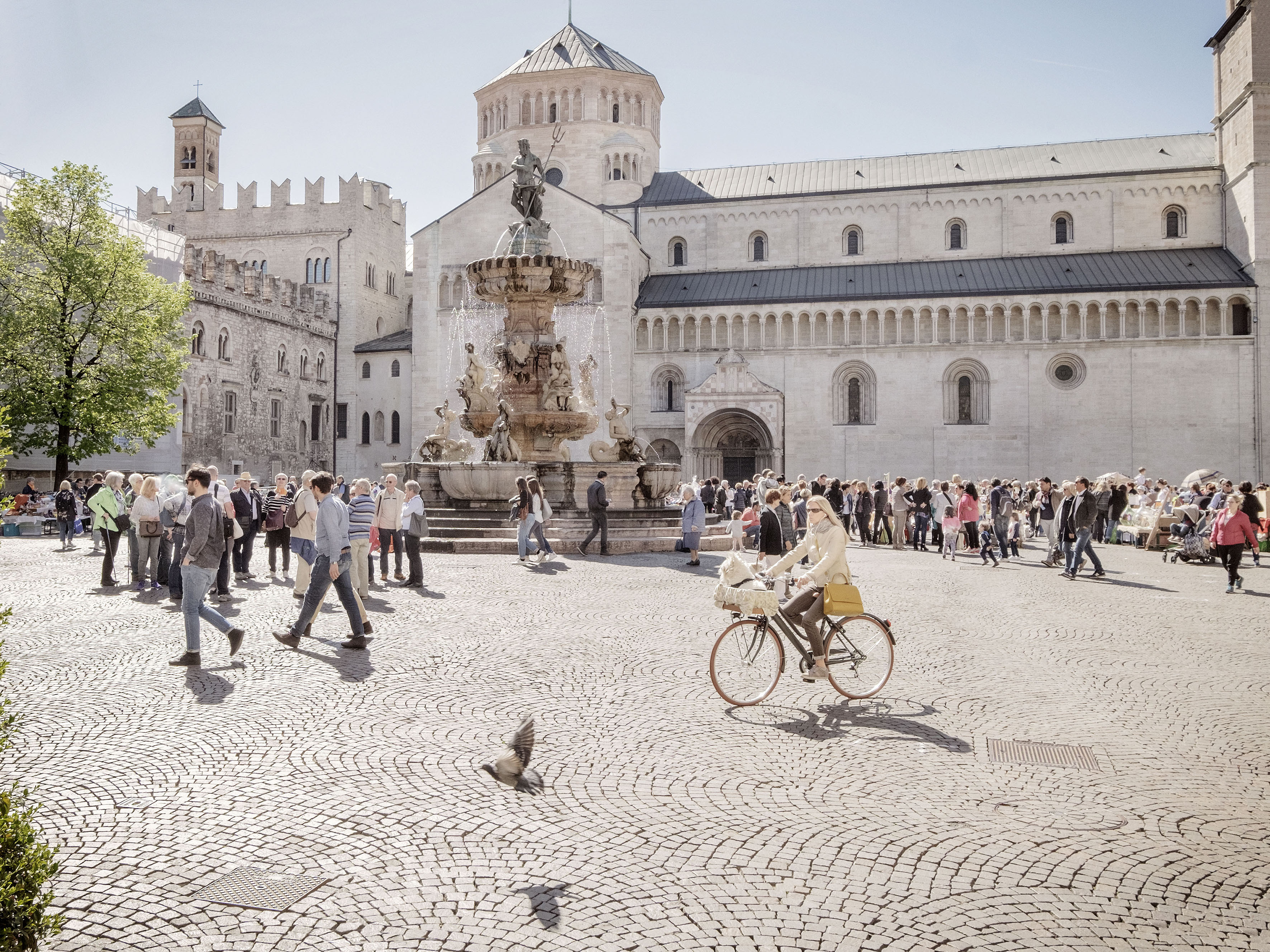 Centrum średniowiecznego i renesansowego miasta jest z pewnością główny plac - Piazza Duomo. Scenograficzny efekt tego miejsca jest zaskakujący: kamienice pokryte renesansowymi freskami, wieże rycerskie oraz cały szereg kamienic o subtelnych barwach, Palazzo pretorio z wieżą Torre civica. Na samym środku placu znajduje się barokowa fontanna Neptuna, a tuż obok niej Katedra św. Wigiliusza – świetny przykład stylu pierwszej sztuki romańskiej. Wystarczy wybrać którąkolwiek stronę świata i udać się na kilkuminutowy spacer w tym kierunku, aby odkryć kolejne atrakcje, które czają się tuż za rogiem: ulica via Belenzani i Palazzo Geremia na północy, średniowieczne mury miasta na południu, dzielnica le Albere i muzeum Muse na zachodzie i wreszcie na wschodzie monumentalny zamek Castello del Buonconsiglio, który wraz z Piazza Duomo stanowi symbol miasta.