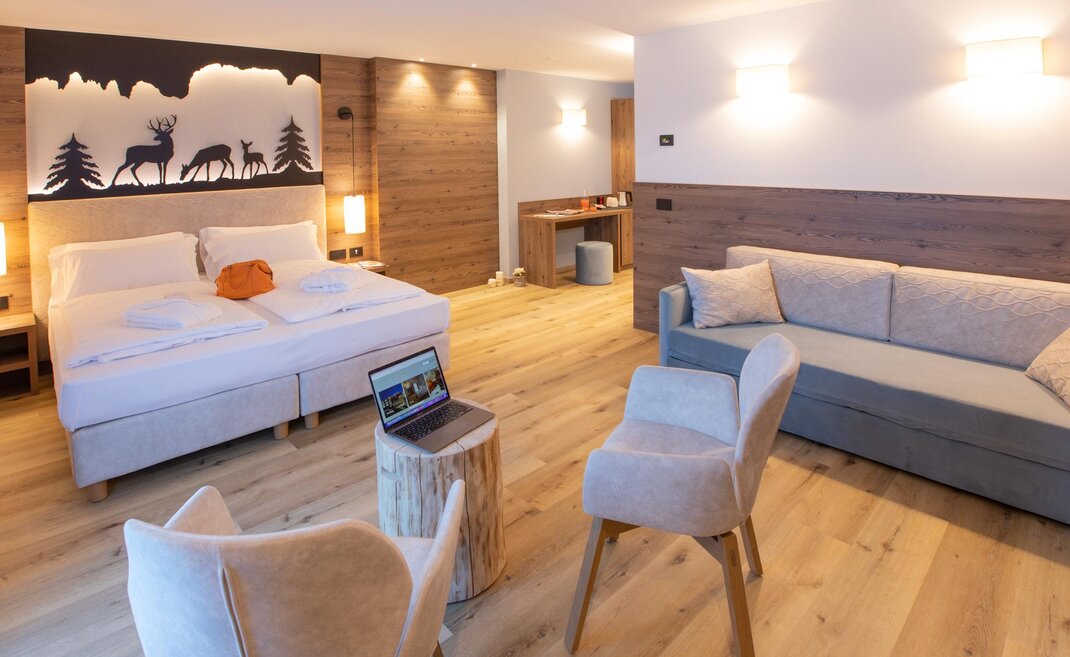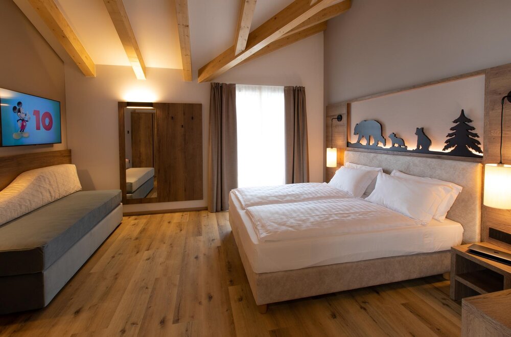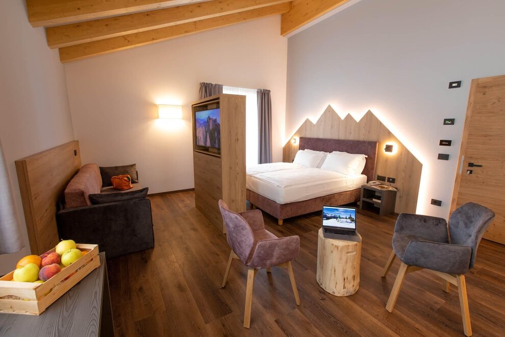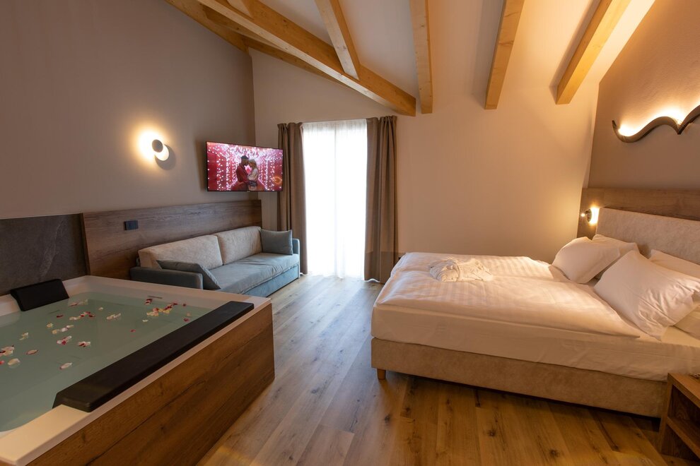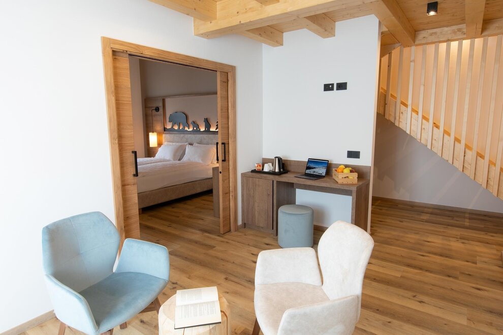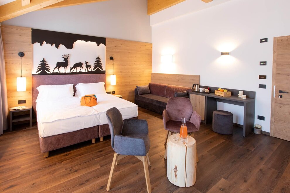 Очарование Доломитов Брента отражается в интерьере с нежными линиями, выполненном из натуральных материалов, и в самом названии номера. Светлые оттенки, варьирующие от бежевого до голубого, придают яркость и тепло, делая этот номер маленьким гнёздышком любви для семей.