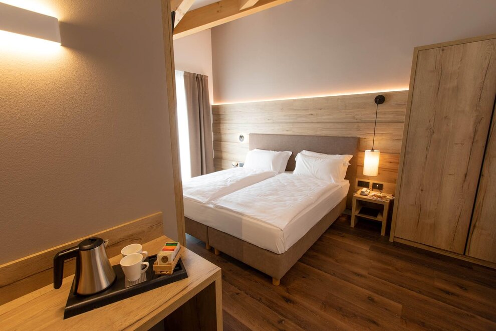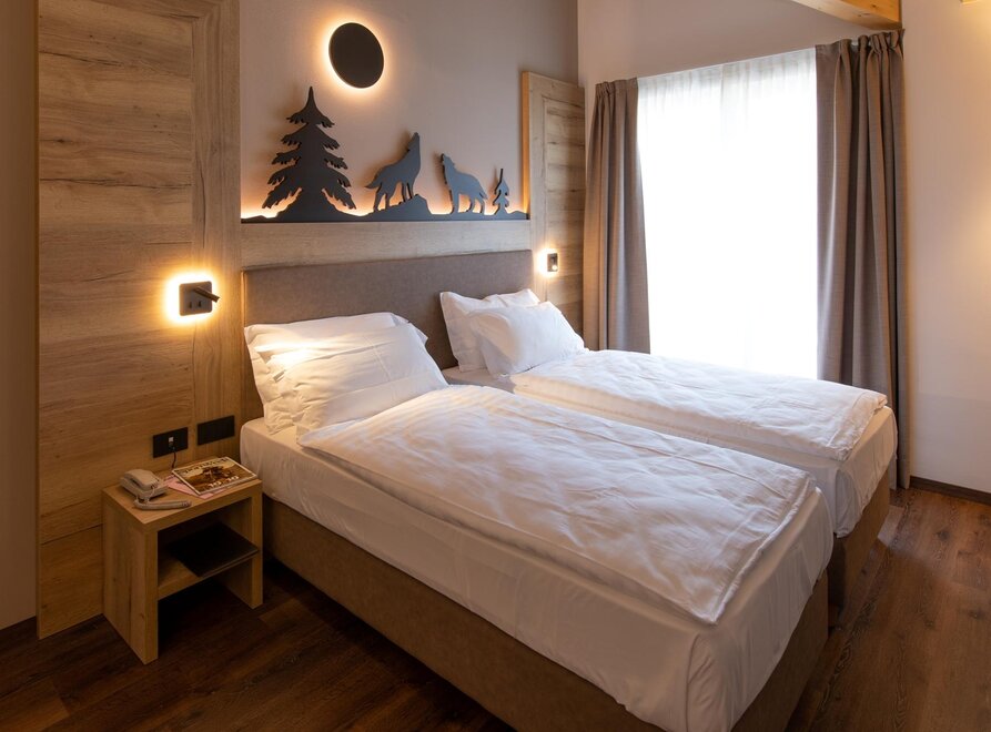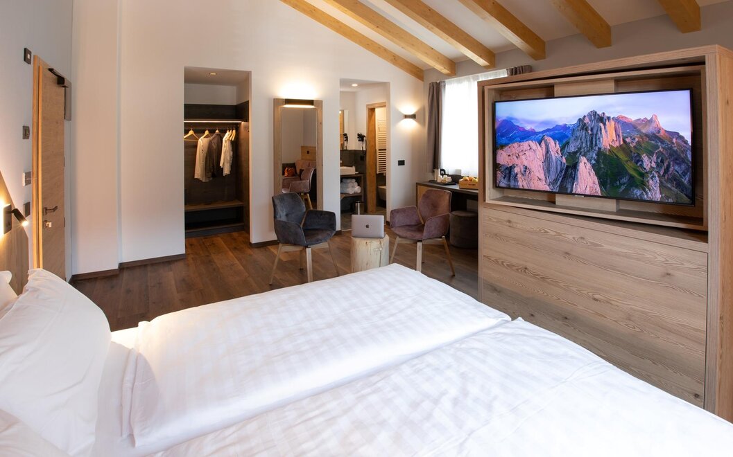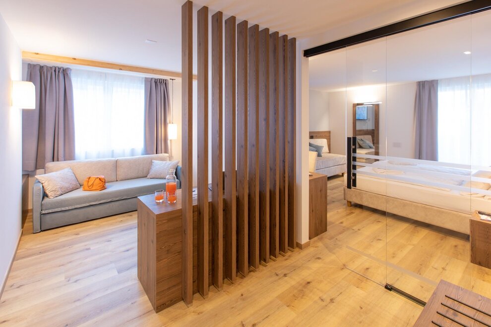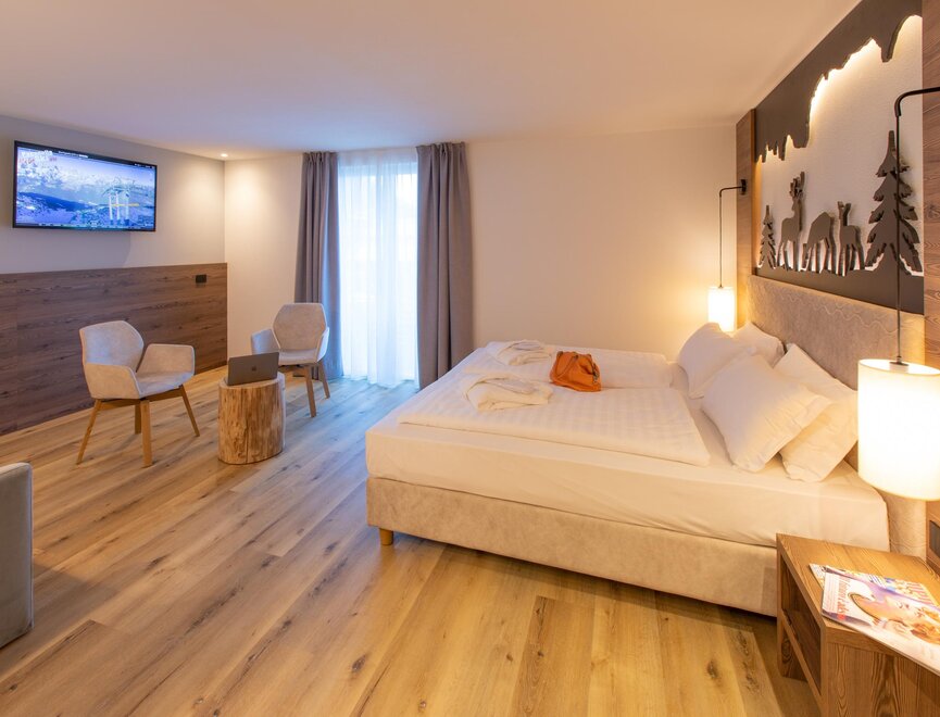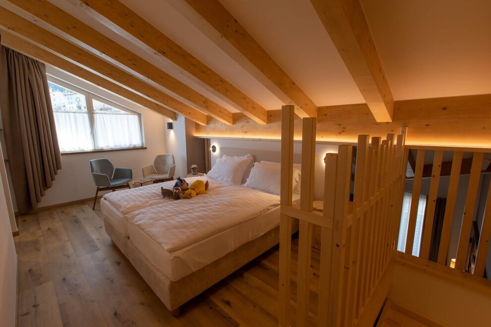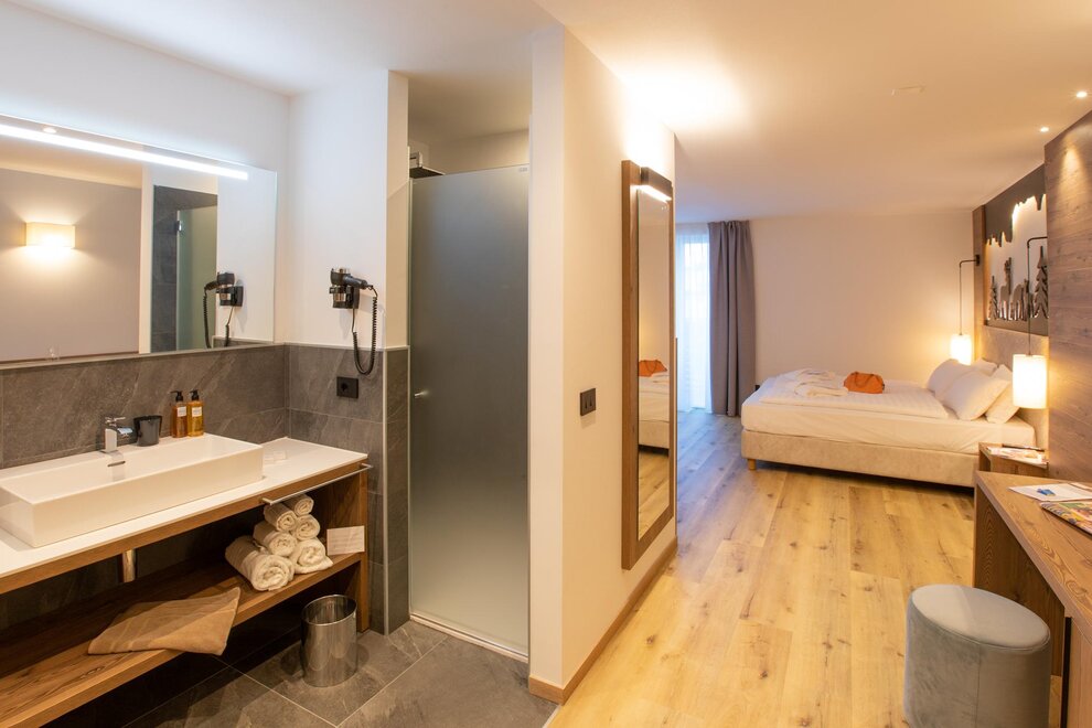 Очарование Доломитов Брента отражается в интерьере с нежными линиями, выполненном из натуральных материалов, и в самом названии номера. Светлые оттенки, варьирующие от бежевого до голубого, придают яркость и тепло, делая этот номер маленьким гнёздышком любви для семей.