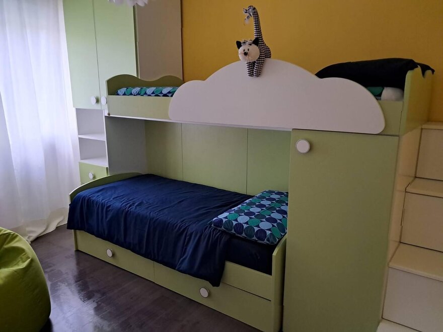 The apartment has an area of 55 square meters and consists of an entrance, living kitchen, double bedroom, a second room for kids with a loft, a bathroom, storage room, and a large terrace. When needed, the sofa in the living room can be transformed into a comfortable double bed.
