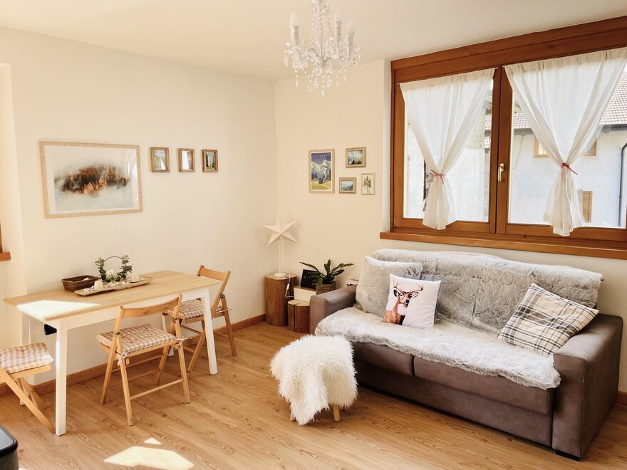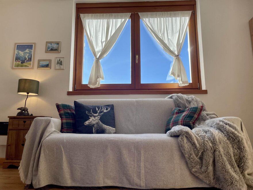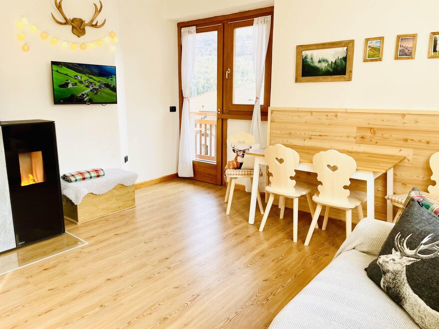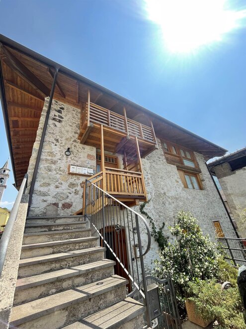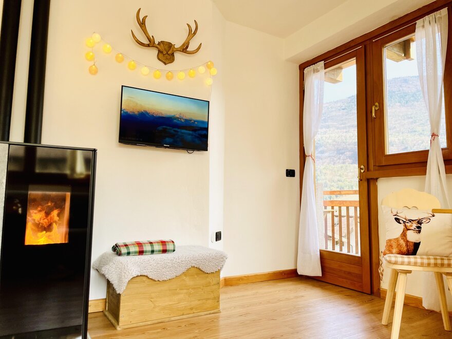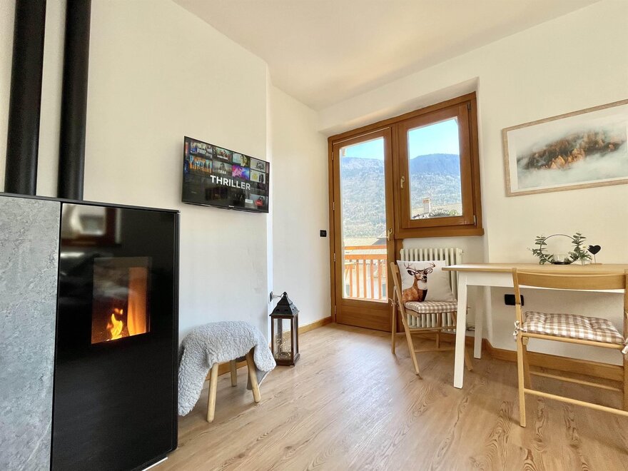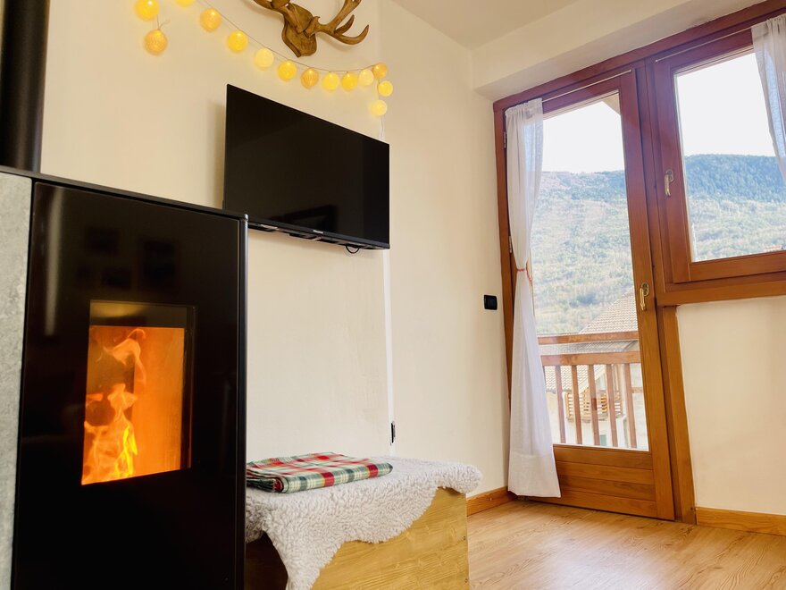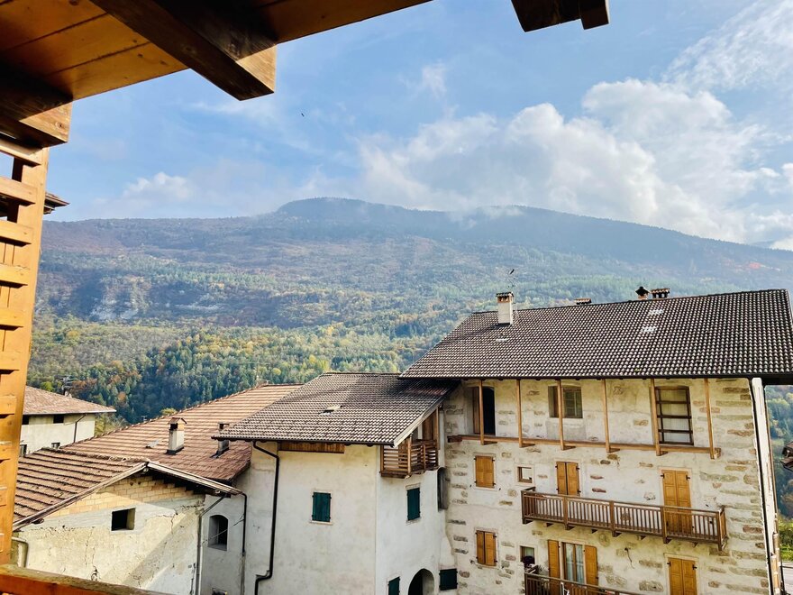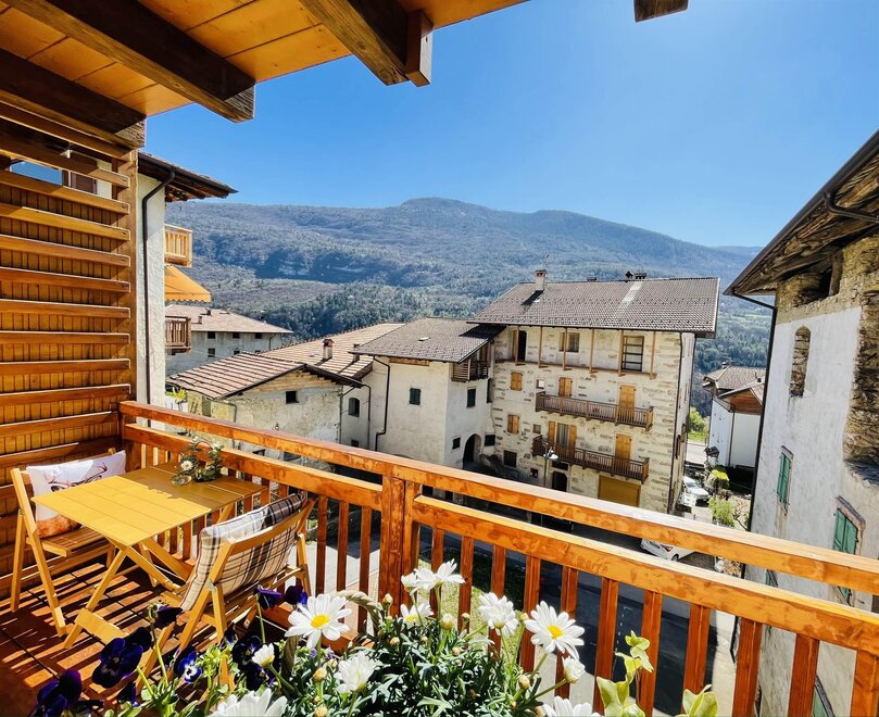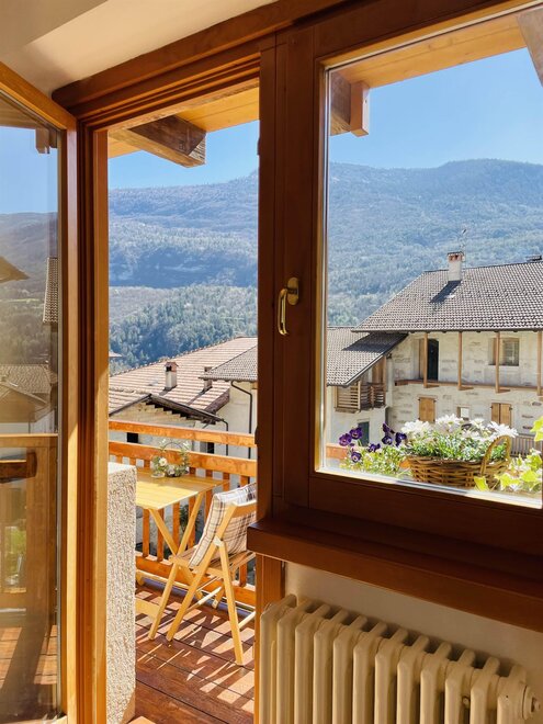 Романтическая квартира имеет большие окна, которые заполняют пространство светом, и балкон с прекрасным видом на исторический центр маленькой деревни и окружающие горы и леса.