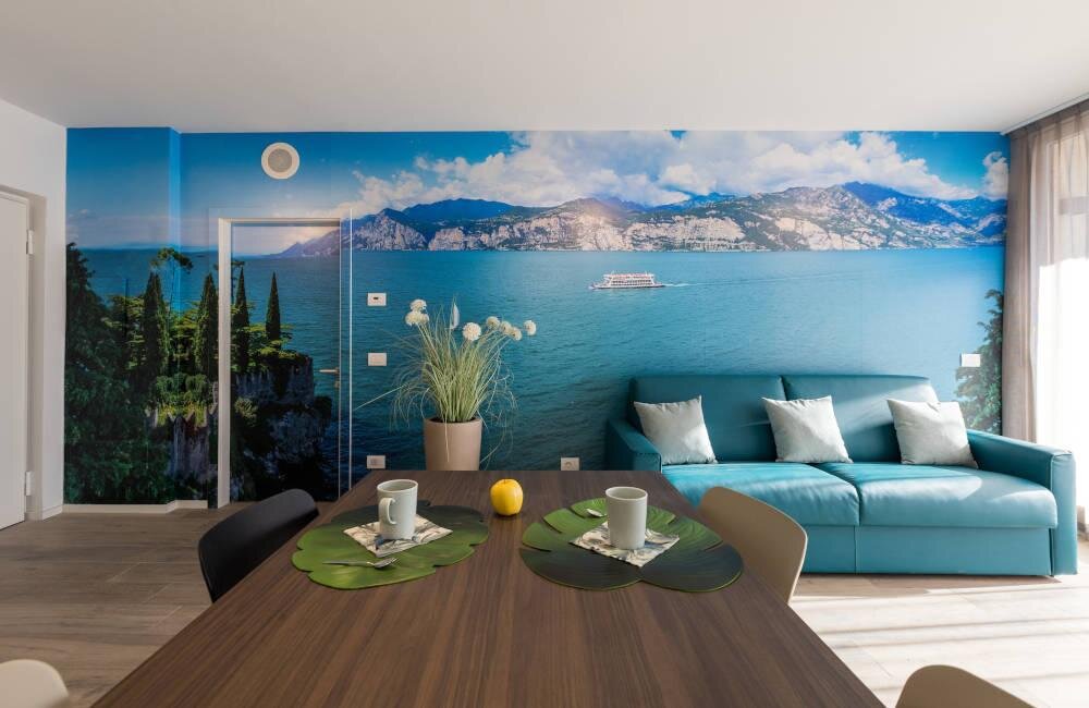 Апартаменты Blue - это идеальное убежище в сердце Наго. Это просторные апартаменты предлагаются с спальней, в которой есть удобная двуспальная кровать, самой большой гостиной среди наших апартаментов с креслом-кроватью и полностью оборудованной кухней. Спальня и гостиная отделены коридором, что обеспечивает максимальную приватность. Апартаменты стильно меблированы, с элегантной мебелью и сочетанием тканей и цветов, создающих уютную атмосферу. Благодаря большой настенной фотопечати замка Мальчезине вам будет казаться, что вы плаваете посреди озера Гарда. Гости могут наслаждаться видом на горы из окон гостиной и использовать бесплатный Wi-Fi, чтобы оставаться на связи во время своего пребывания.