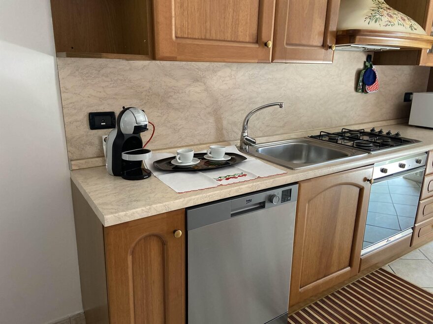 Апартамент состоит из двух спален (одной супружеской и одной одиночной), ванной комнаты и светлого пространства, объединяющего кухню и гостиную. Балкон выходит на площадь деревни, предлагая приятный вид на поселок.