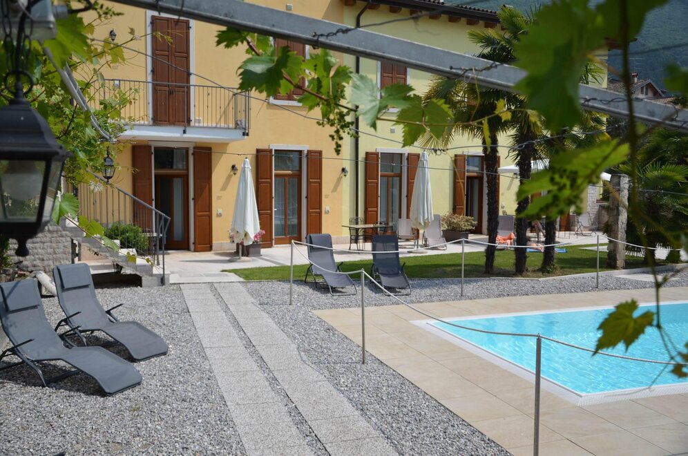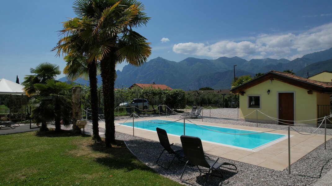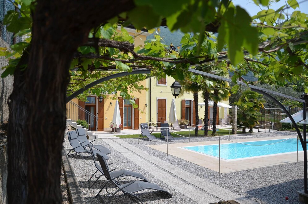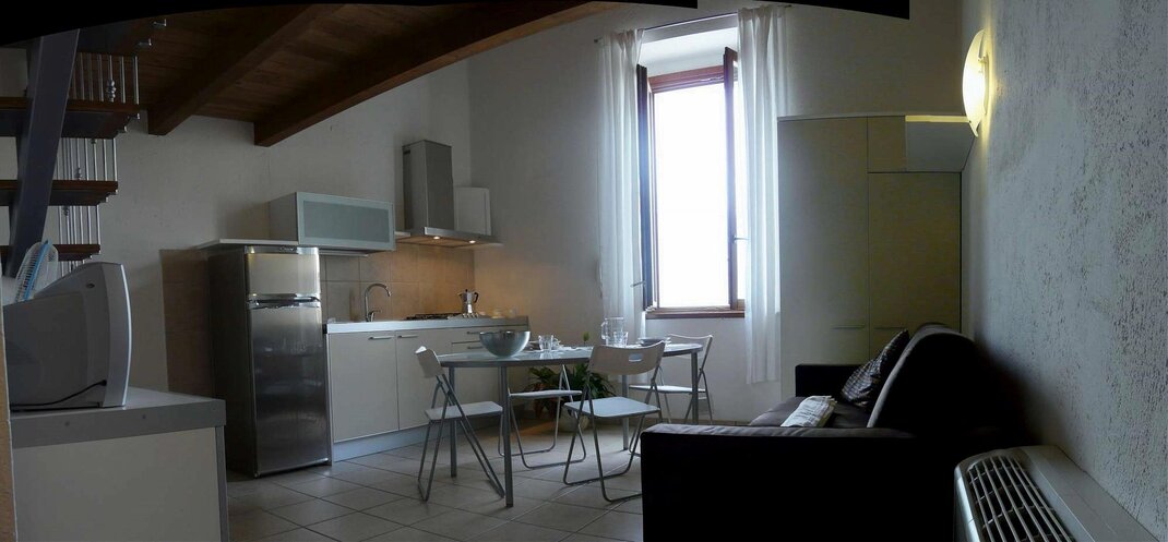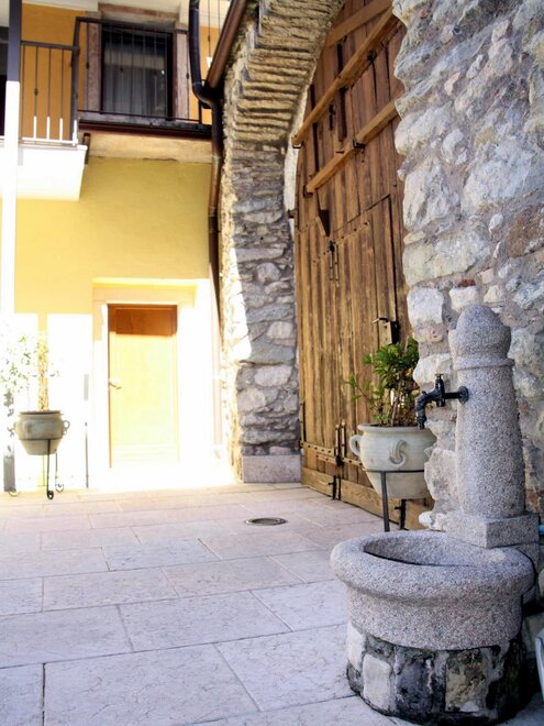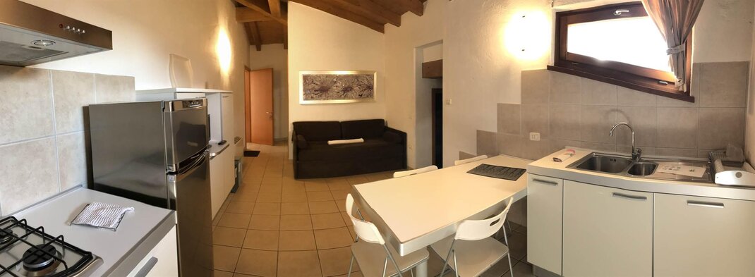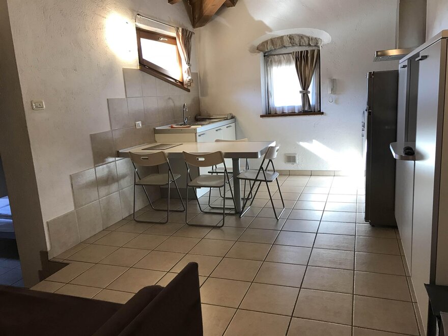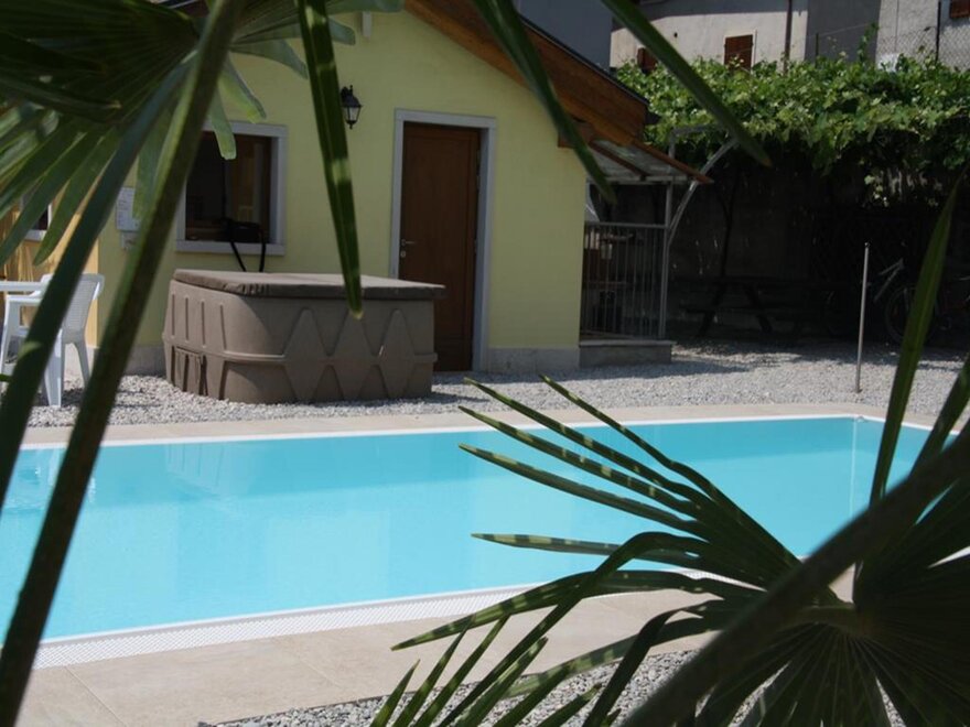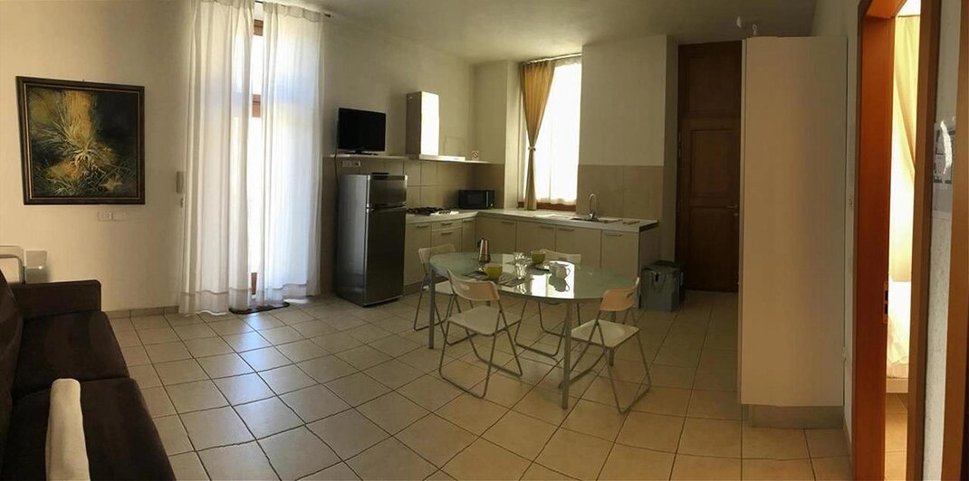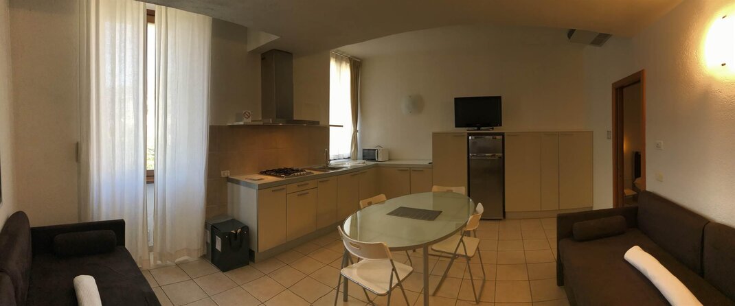 Апартамент 5 Джовe (43 кв.м) è б илocale с видом на бассейн, который выходит на маленькую внутреннюю площадь. На площадь можно попасть, войдя через старинные боковые ворота здания. В зоне отдыха с кухней находятся два дивана с раскладными кроватями. На площади есть два стола, которые можно использовать совместно с еще четырьмя апартаментами. В летний период доступны два пронумерованных шезлонга, которые, соответственно, являются частными и расположены у бассейна.