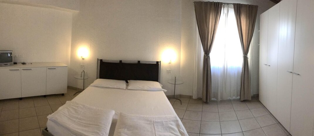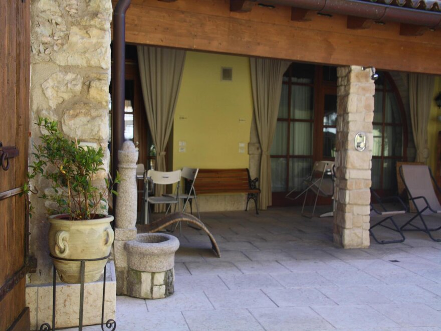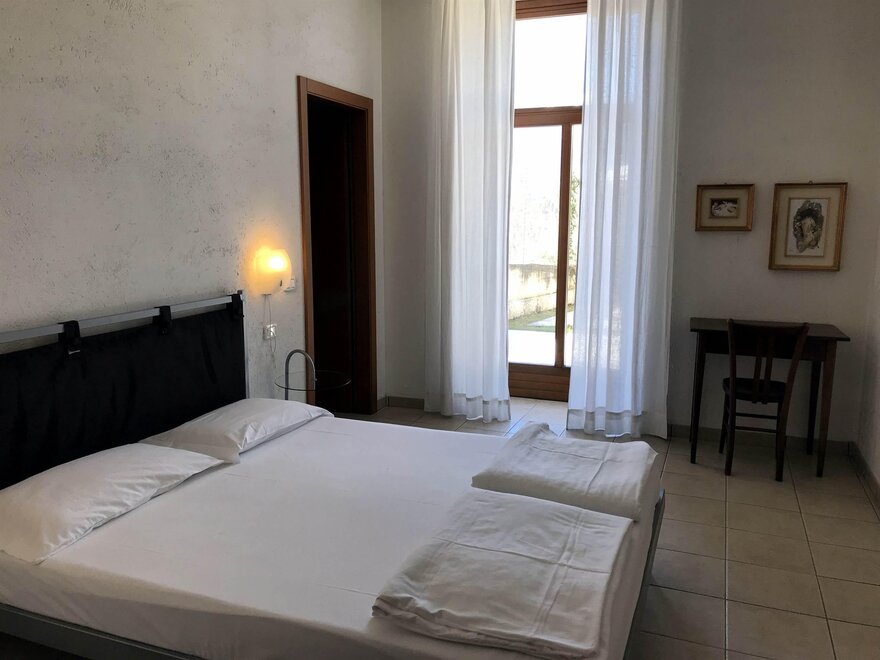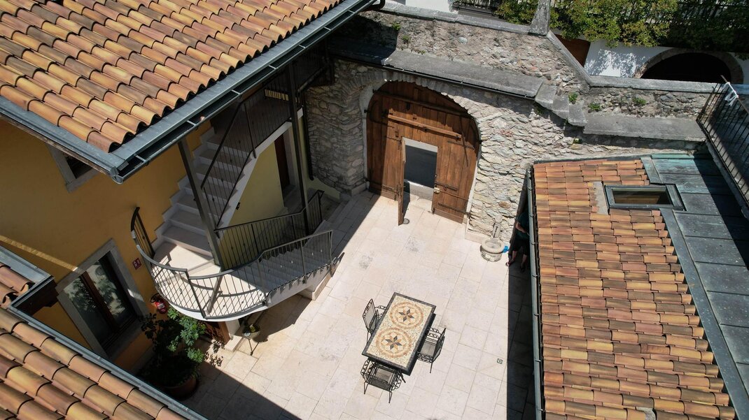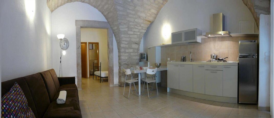 Апартамент с одной спальней, выходящий на внутреннюю площадь, в которую можно войти через старинные боковые ворота здания. На площади доступны два стола, которые можно использовать совместно с другими четырьмя апартаментами. На летний период доступны два нумерованных шезлонга, которые являются личными, расположенные у бассейна.