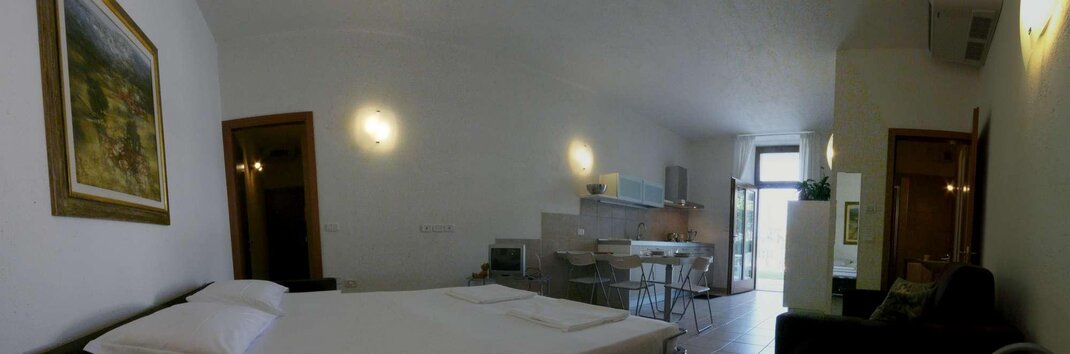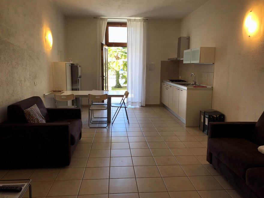 Аппартаменты 3 Терра, большая двушка с видом на бассейн. В зоне отдыха имеется двуспальный диван-кровать и кресло-кровать; Апартаменты Терра è оснащены отдельным патдио для обедов на свежем воздухе. В летний период доступны два шезлонга.