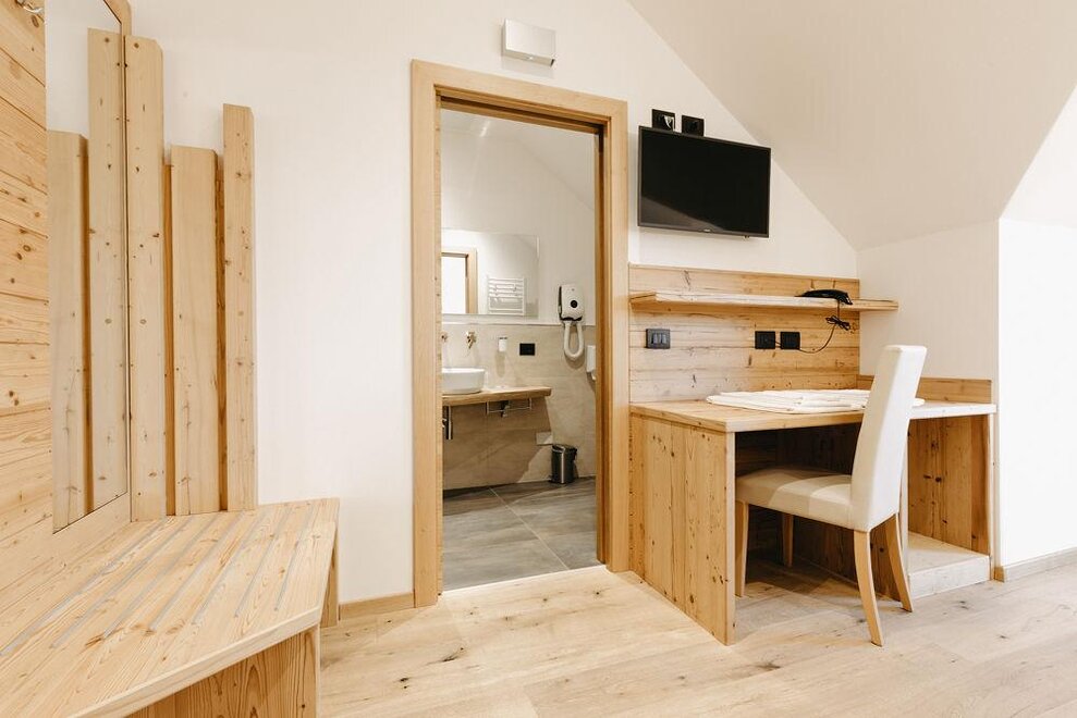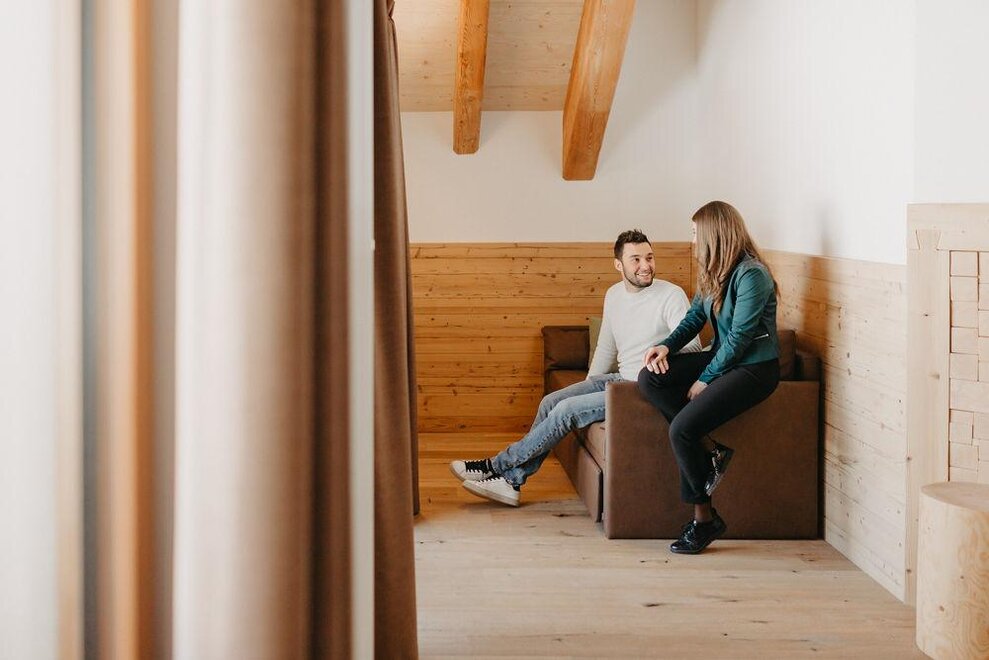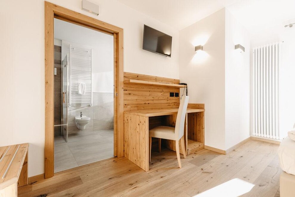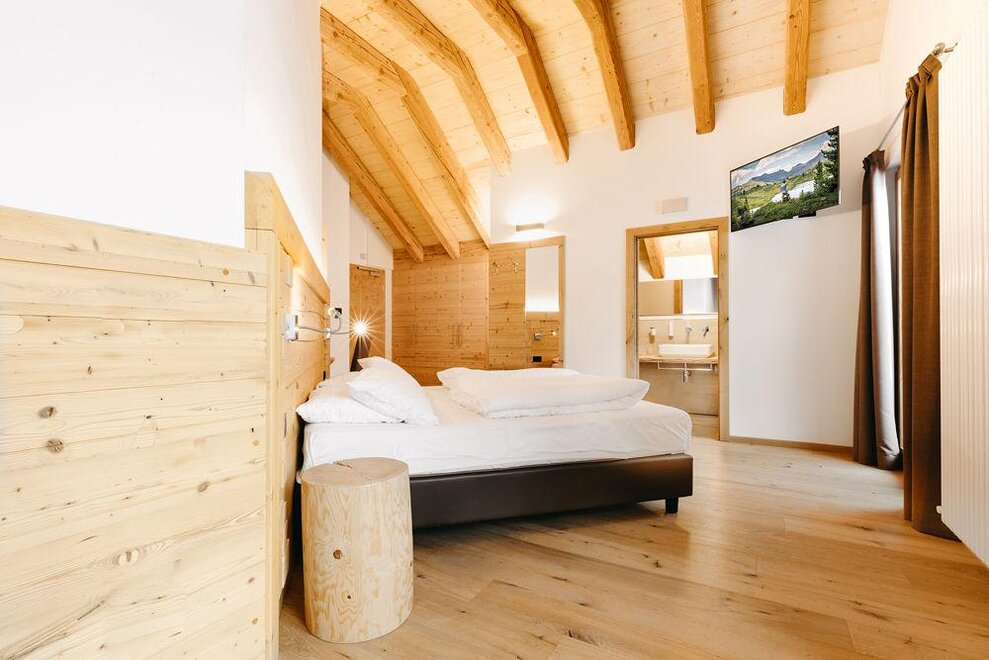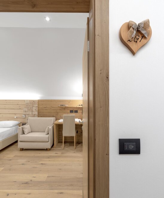 Джуниор люкс - идеальный номер для тех, кто хочет отключиться от напряженной рабочей жизни.Широкие окна соединяют комнату с просторным частным балконом, построенным из массива дерева, и позволяют наслаждаться видом на снежные горы и окружающие луга. Джуниор люкс с натуральным дубовым полом и деревянным потолком состоит из номера с двуспальной кроватью и гостиной с удобным диваном, который также можно разложить. Здесь вы сможете насладиться спокойствием пейзажа, потягивая травяной чай, который вы можете легко приготовить благодаря уголку для чая, который мы подготовили для вас. Большая ванная комната, оборудованная всеми удобствами. Бесплатная парковка.