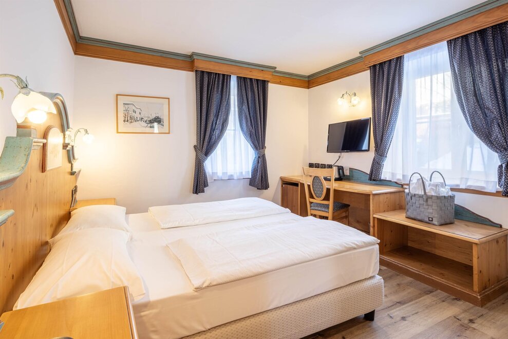 Our Classic rooms, 20 sqm, face north towards the woods of Cavalese. They are furnished in typical mountain style with wood-effect flooring. These rooms, without balcony, are the right combination of convenience and comfort. What you will find in your classic room: