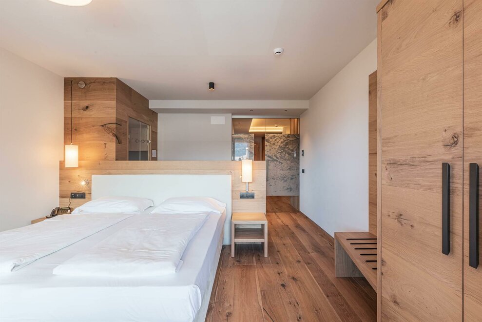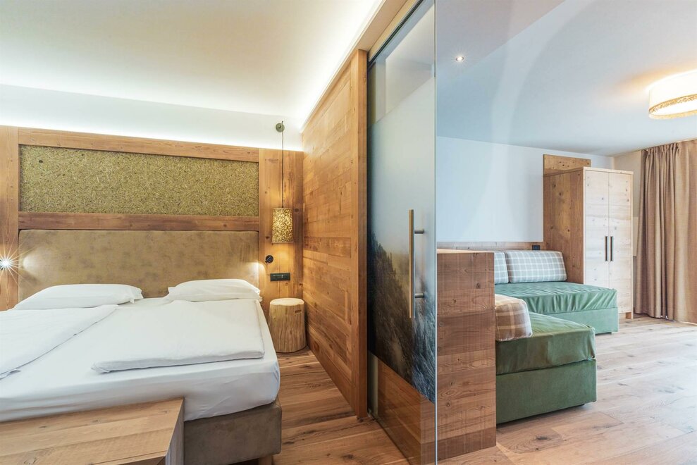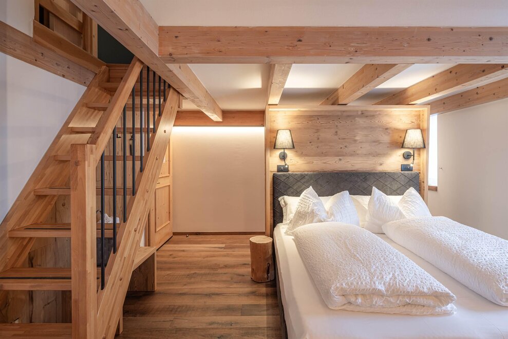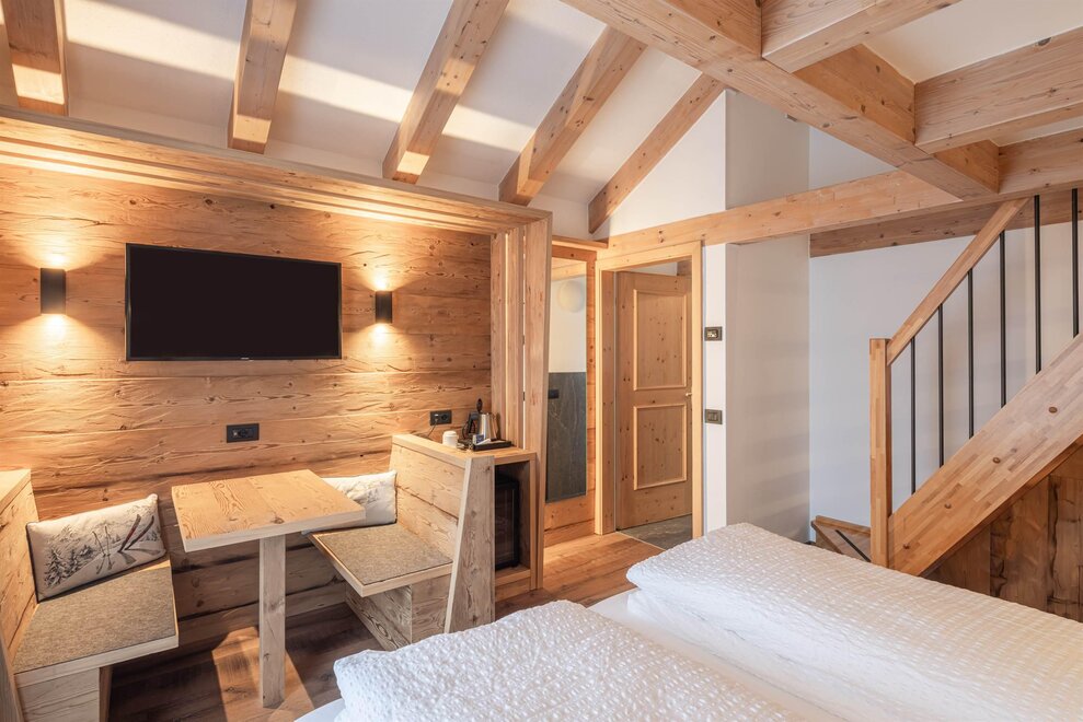 Our Junior Suite, 33 sqm, is on two levels: a double bed on the ground floor and a loft with a single bed and another pull-out bed. The room can accommodate up to 4 people, has a balcony with south view and is furnished in typical mountain style.