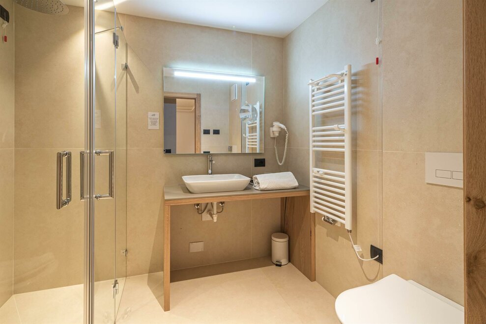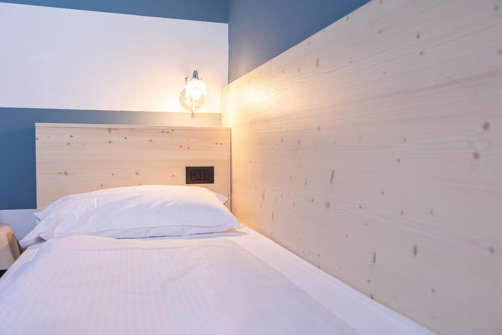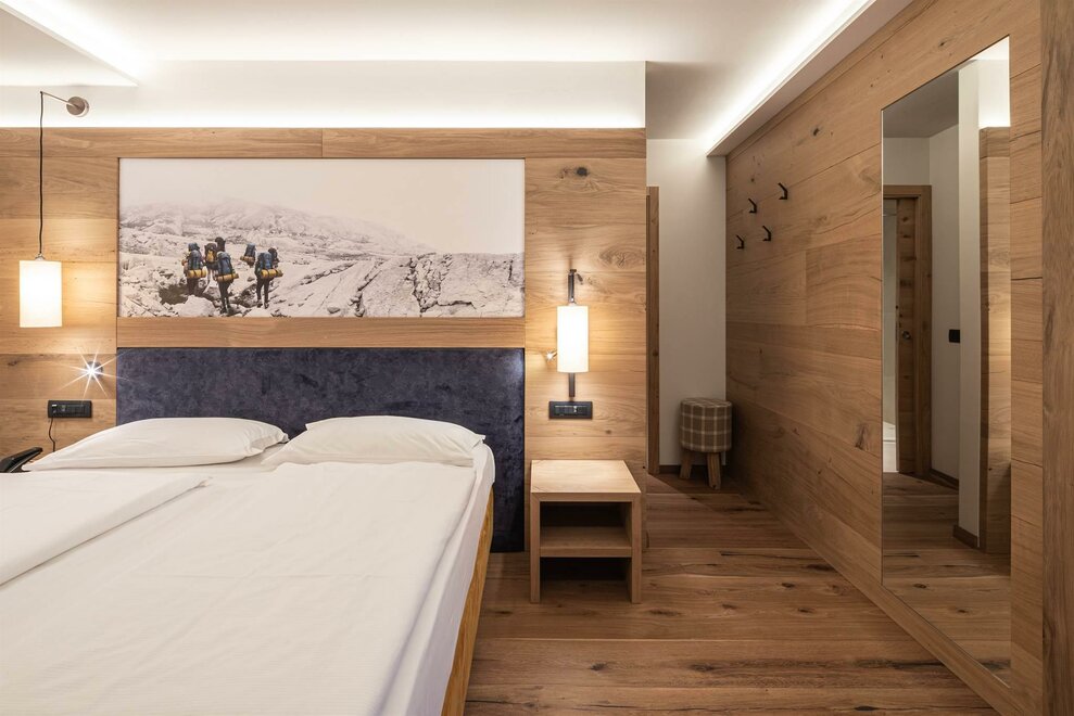 Our 20 sq m Comfort double rooms are different from the Classic rooms because they have a private balcony, facing north or south, from which you can admire the view of the mountains and forests of Cavalese. The furniture is typical mountain style with wood-effect flooring. What you will find in your classic room: