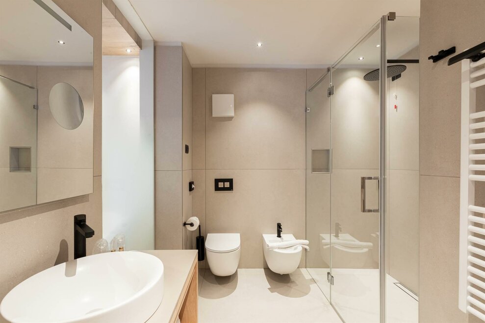 Our Suite SPA Tribu, Mountain Living, 68. Up to 50 sqm of full well-bein. Unforgettable momets for a romantic or family holiday, in our suites you will find Bio-Sauna Hydrosoft and bath-tub in the center of the room. All details are well finished with precious local material and wood, handcrafted by local artisans. Facing south, our suites with big balcony offer you panoramic view on the Lagorai Chain with its spectacular woods. The room is non-smoking ad offers you:
