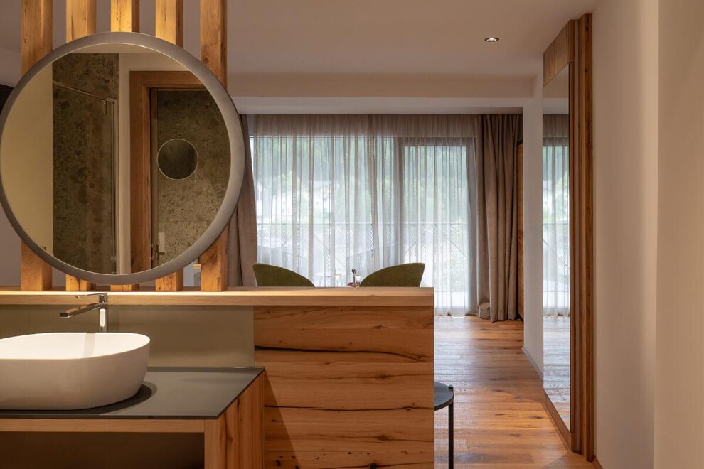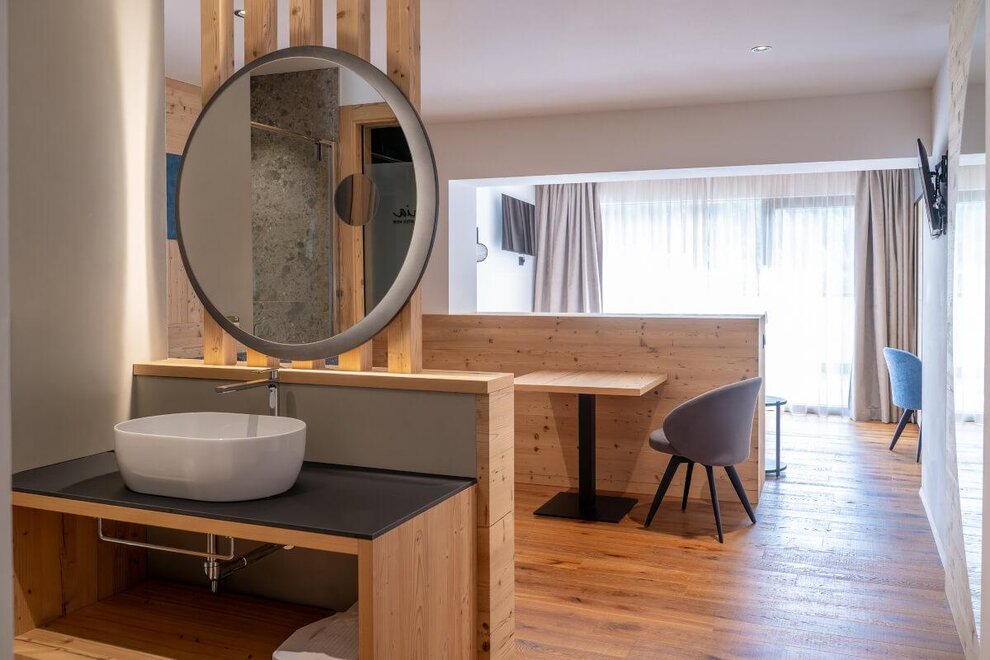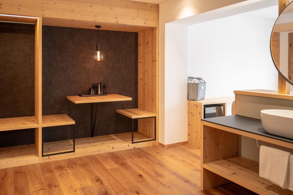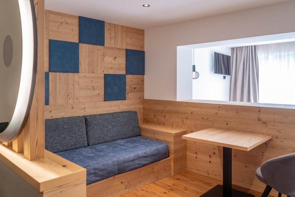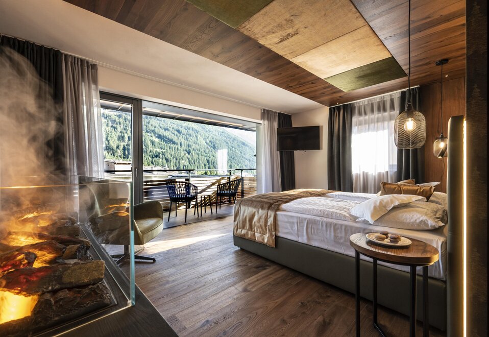 Экология, устойчивость и простор характеризуют эти совершенно новые Джуниор Сьюты, оформленные с использованием окисленного дерева, восстановленного из старых альпийских амбаров, и тканей из натуральной шерсти. Кровать размера "king-size", просторная гардеробная с зеркалом от пола до потолка, отдельная зона отдыха и собственный балкон дополняют оформление с дополнительным комфортом в экологическом стиле.