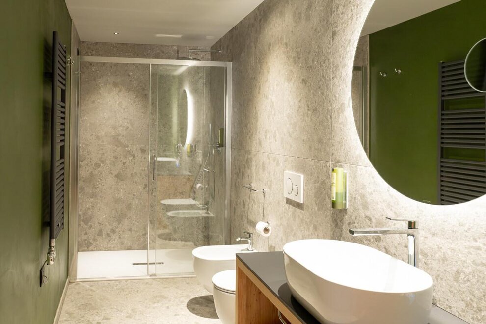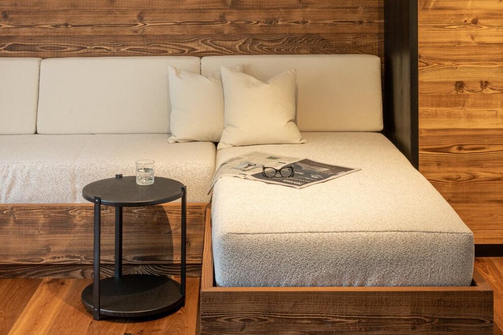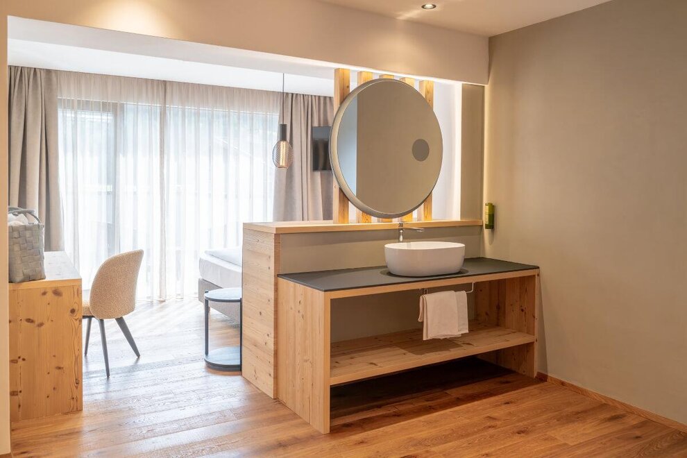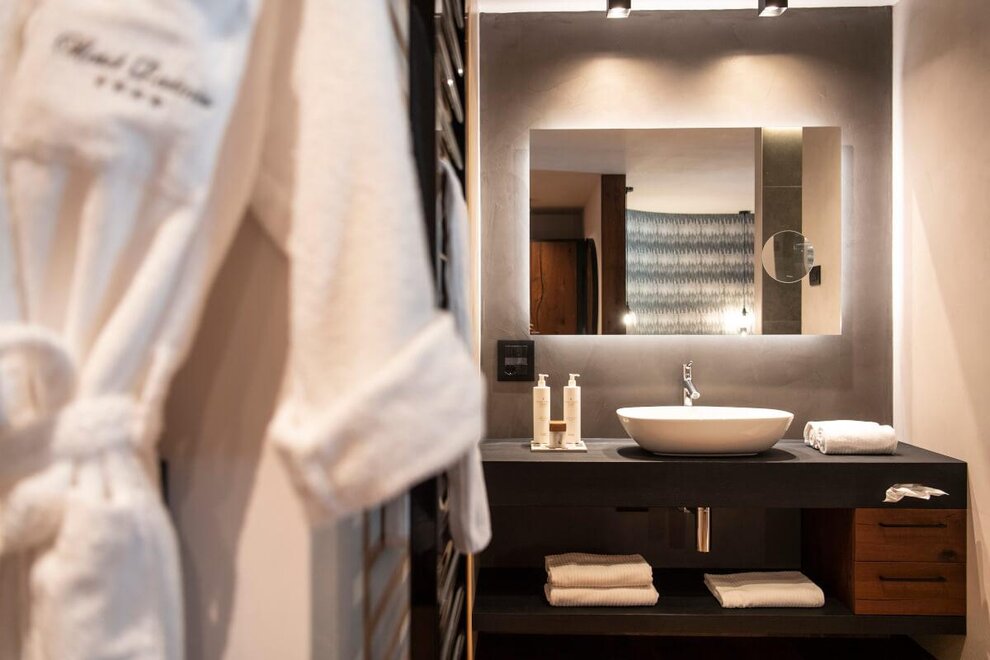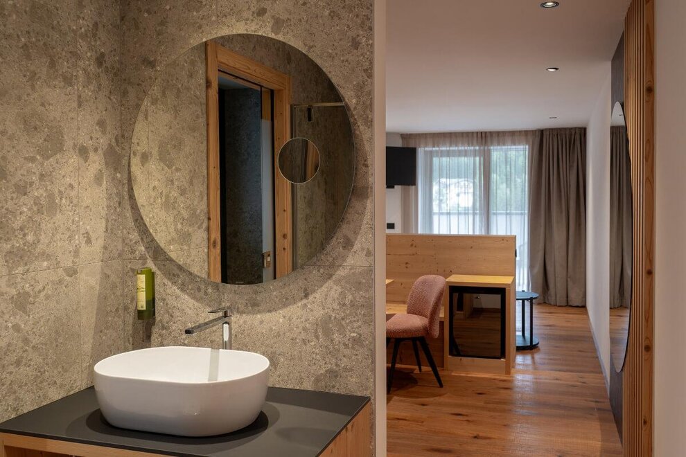 Экология, устойчивость и простор характеризуют эти совершенно новые Джуниор Сьюты, оформленные с использованием окисленного дерева, восстановленного из старых альпийских амбаров, и тканей из натуральной шерсти. Кровать размера "king-size", просторная гардеробная с зеркалом от пола до потолка, отдельная зона отдыха и собственный балкон дополняют оформление с дополнительным комфортом в экологическом стиле.