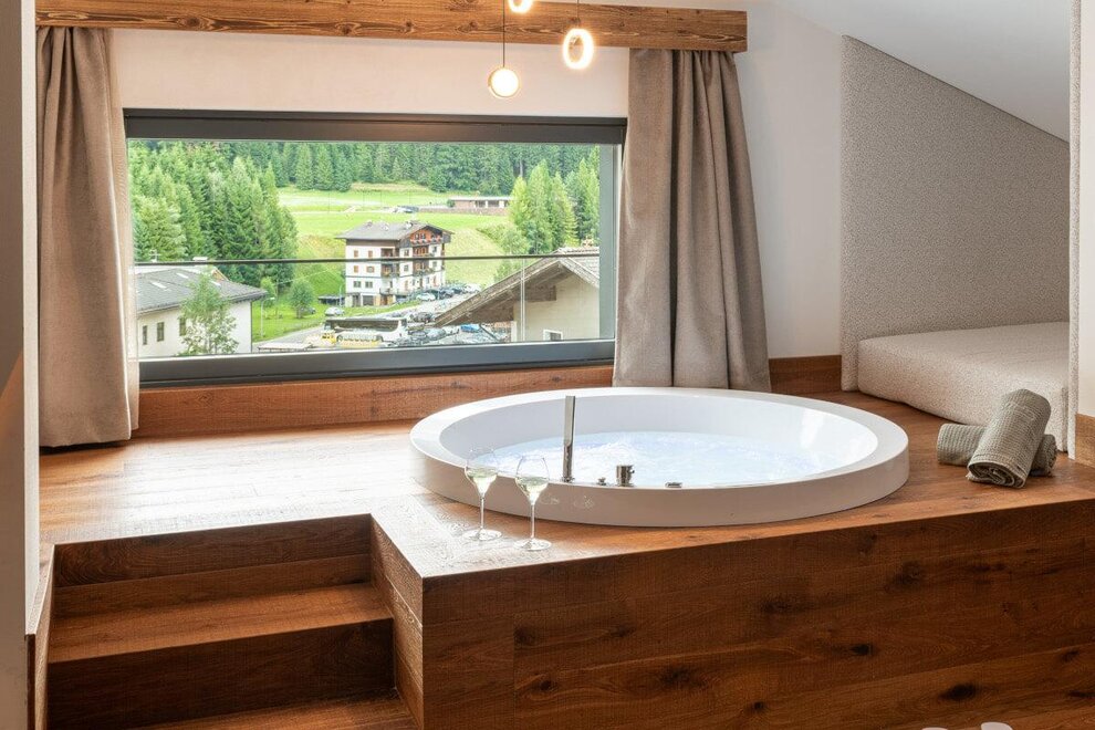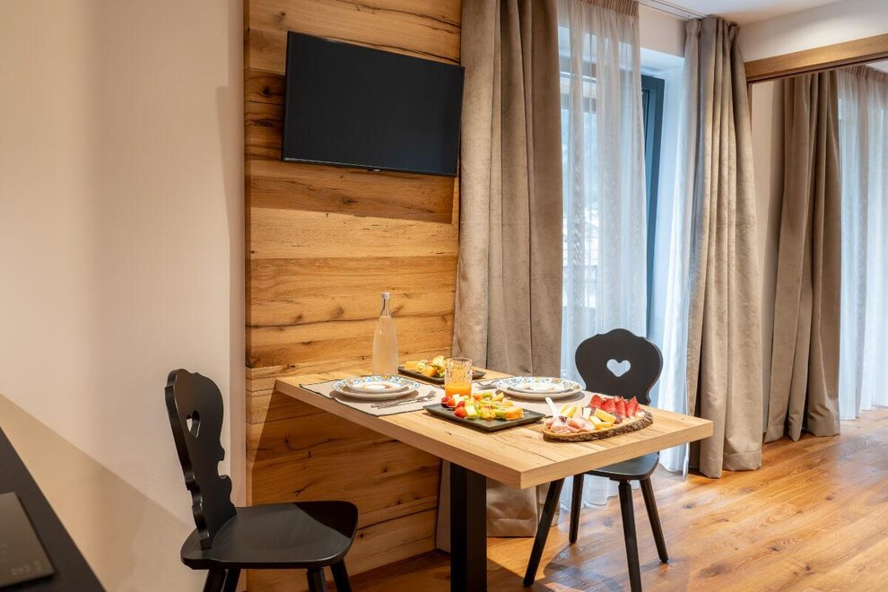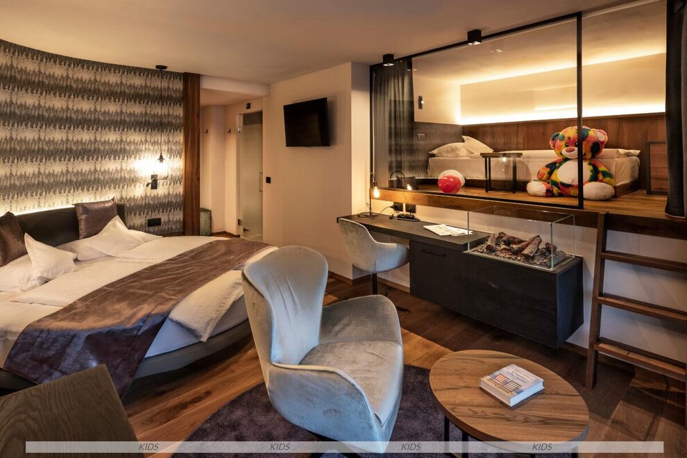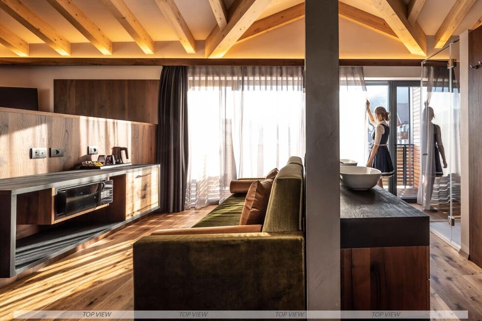 Удивительные люксы, которые заставят вас мечтать, благодаря потрясающему виду на небосвод с вершинами Доломитов, который можно наслаждаться, удобно расположившись в своей кровати. Их отличают эксклюзивные удобства: оформленная в новом стиле “Alpine Lifestyle” зона отдыха из старого дуба, отдельная спальня с кроватью размера king size, био-камин и частная инфракрасная сауна с целебной пихтовой древесиной.