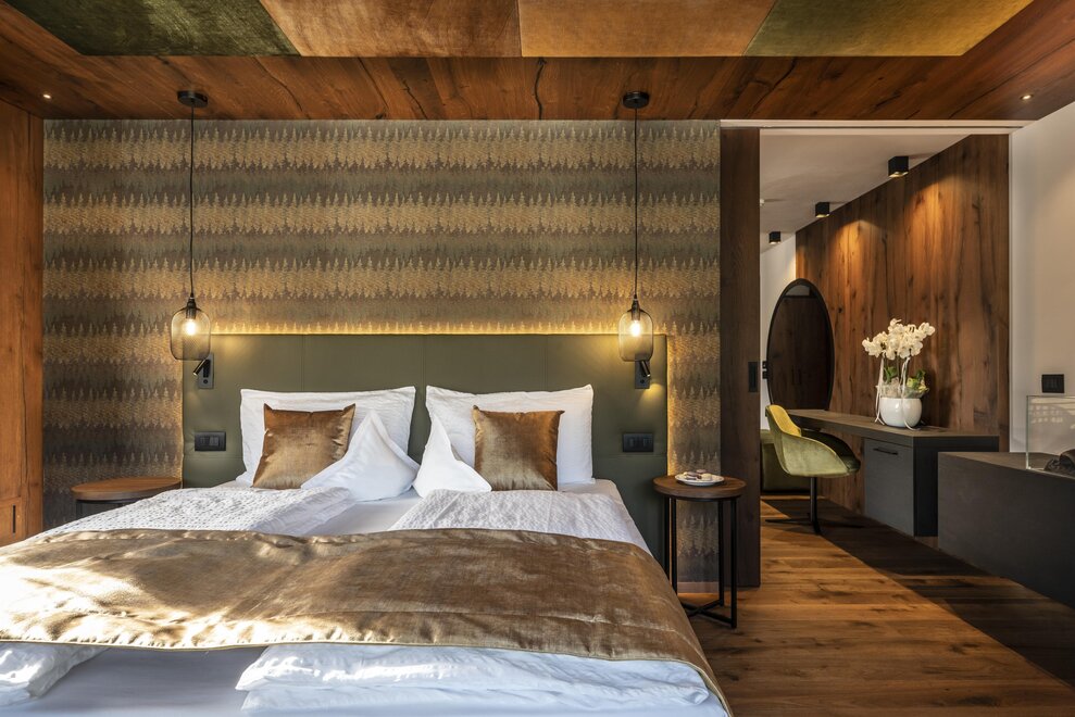 Удивительные номера-люксы, которые заставят вас мечтать, благодаря потрясающему виду на землю и небо с дольомитовых вершин, которые можно любоваться, удобно расположившись на вашей кровати. Их отличают эксклюзивные удобства: жилая зона, оформленная в новом стиле «Альпийский образ жизни» из старого дуба, отдельная спальня с кроватью king size, био-камин и частная инфракрасная сауна с полезной древесиной кедра.