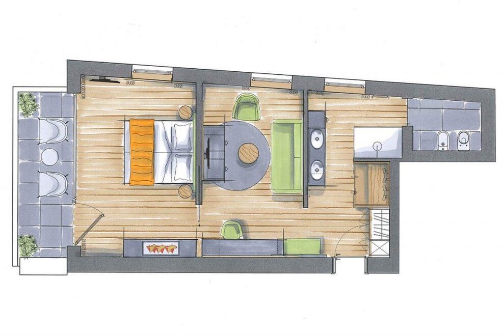 Новый формат для Ладинии: 45 кв. м общего комфорта для тех, кто любит жить в максимальной свободе и автономии, не отказываясь от услуг отеля 4 звезды. Этот люкс встречает вас просторной гостиной с современной кухней и панорамными окнами от пола до потолка. Светлая спальня, окруженная балконом с обеих сторон и с видом на Доломиты. Все обставлено в сочетании дуба и темных тонов, что придает ему современный и притягательный вид.