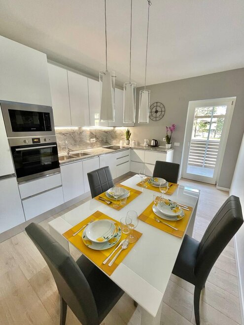Квартира, завершенная в конце 2022 года, оформлена в теплом и уютном стиле, с всеми необходимыми удобствами; состоит из двух спален, ванной комнаты с душевой кабинкой, гостиной, кухни с oven/посудомоечной машиной/микроволновой печью, стиральной машины, просторных террас для каждой комнаты, открытого частного парковочного места и гаража, который также может использоваться как склад для велосипедов или спортивного оборудования.