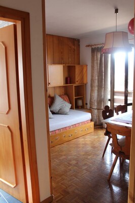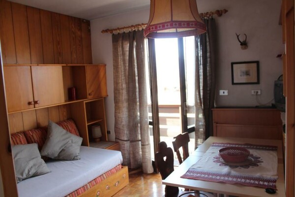 Уютная двухкомнатная квартира в прекрасном тихом и солнечном месте в Пера ди Фасса. Квартира окружена просторным балконом, откуда открывается великолепный вид на долину и вершины Ундичи и Додичи. Всего в нескольких минутах от дома находится подъемник: Катиньчо/Чампе́дье (Гардечча для Вайолет), велосипедная дорожка вдоль Авизио и горнолыжная школа. Квартира расположена на втором и последнем этаже, окружена просторным балконом, выходящим на юг-восток. Она состоит из: спальни с двуспальной кроватью, гостиной с кухонным уголком (разделенным перегородкой) и раскладным диваном (на два места), ванной с окном и ванной-насадкой. Квартира снабжена всем необходимым для проживания. Есть телевизор, стиральная машина, утюг, фен. Кондиционное парковка и красивый общий сад с зоной для барбекю и большим столом с лавками. При необходимости — отдельное помещение для хранения.
