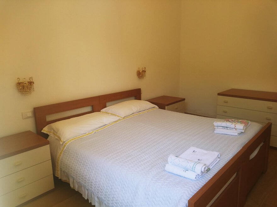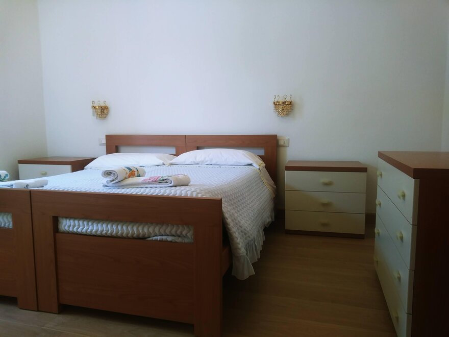 Квартира может вмещать до 5 человек, состоит из кухонной зоны, ванной комнаты и двух просторных спален: одной с двуспальной кроватью и другой с тремя односпальными кроватями.