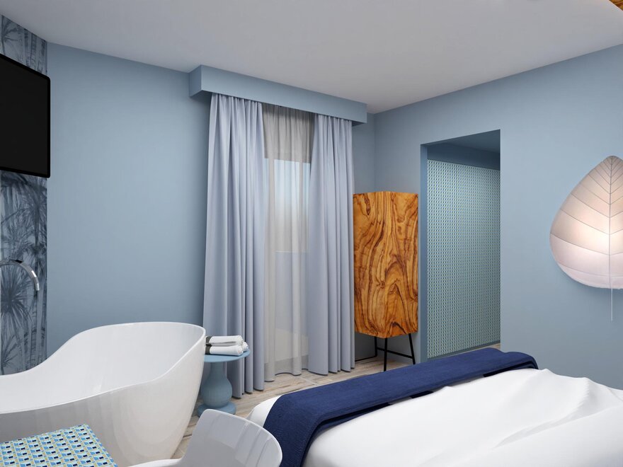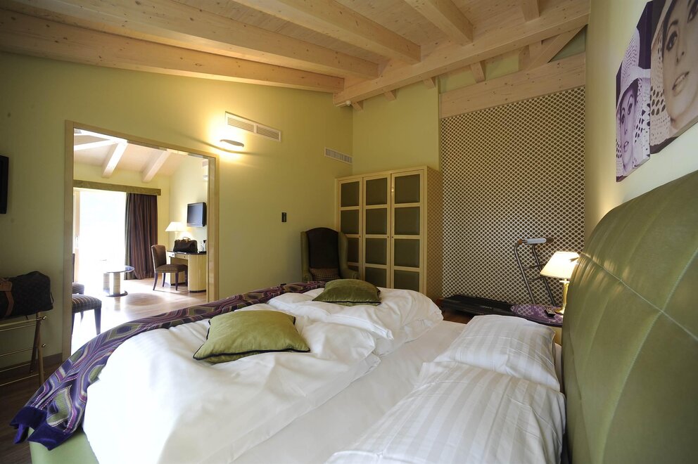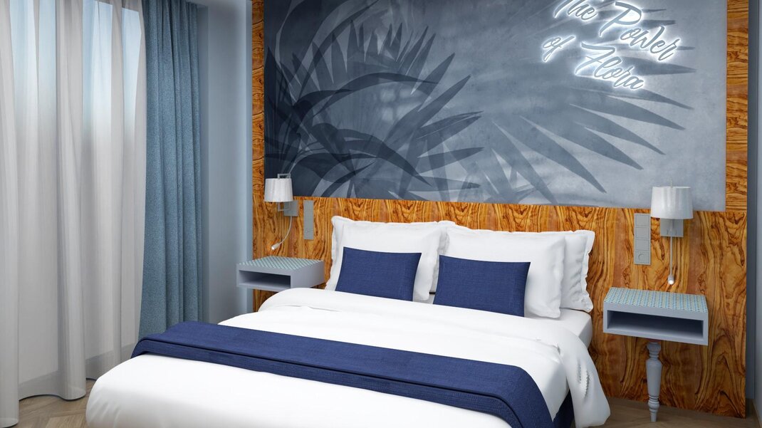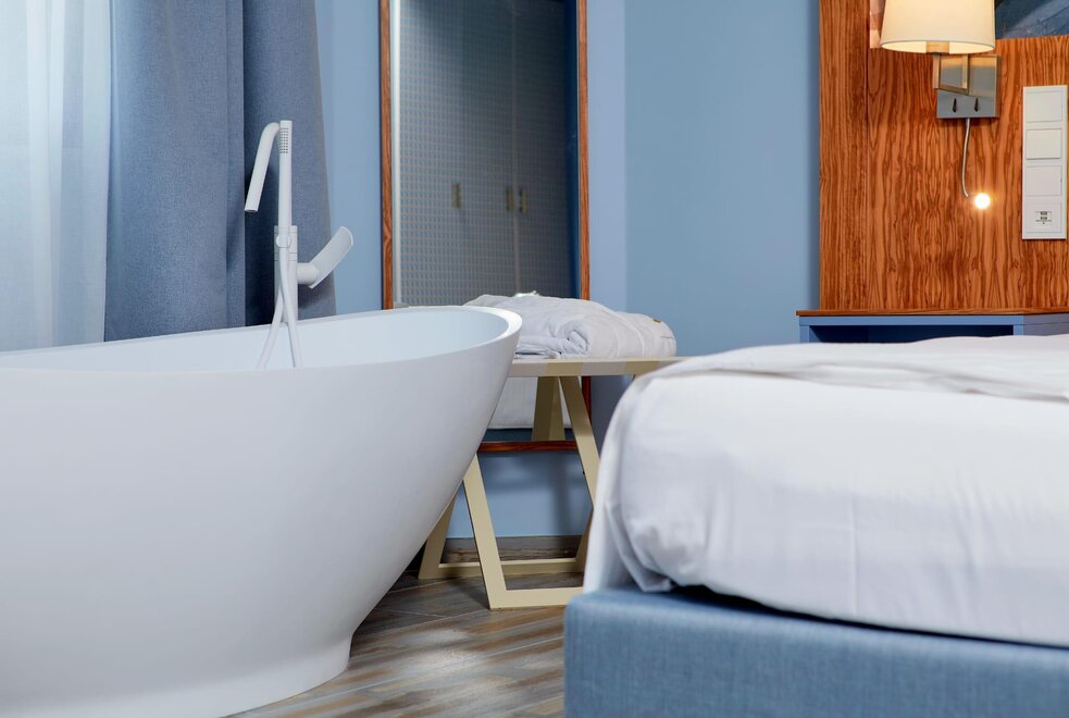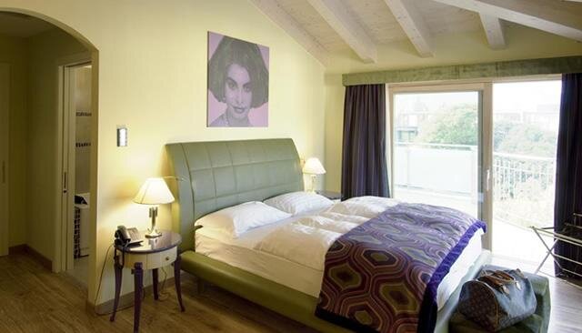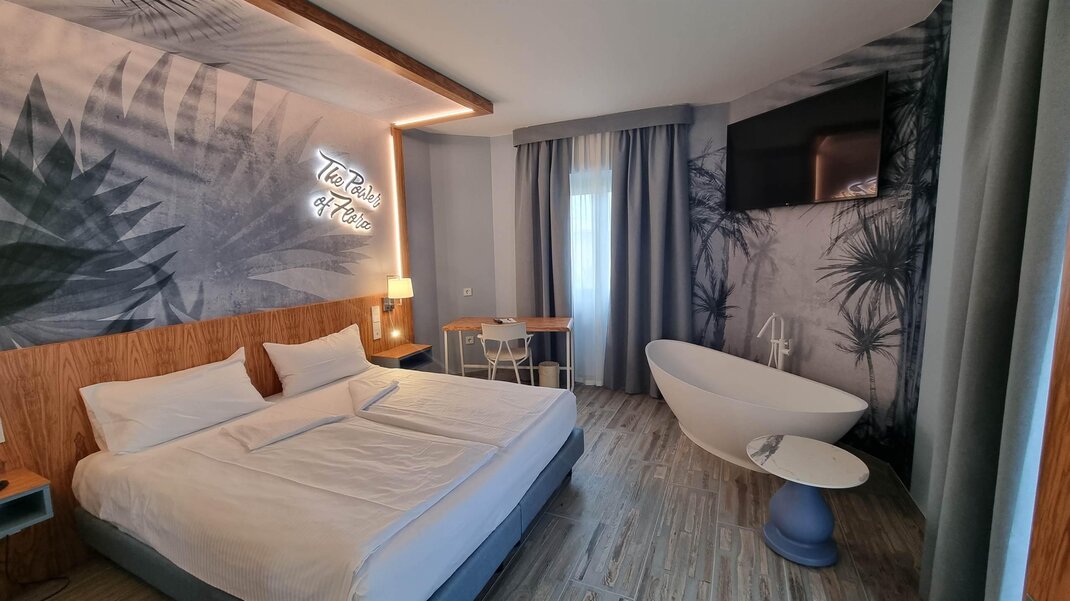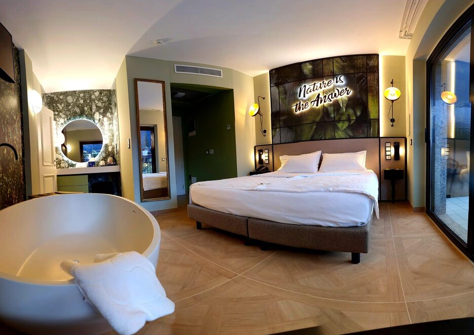 Гармоничные номера с двуспальными кроватями (макс. 2 человека), пол из бетона, ванна "фристендинг" в комнате и ванная с душем, балкон с видом на горы или уличная парковка. Двуспальная кровать, состоящая из 2 соединённых односпальных матрасов