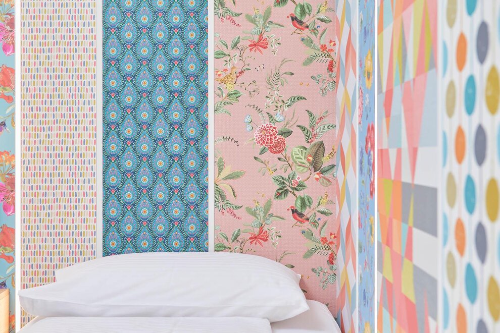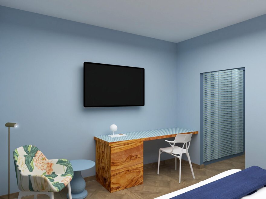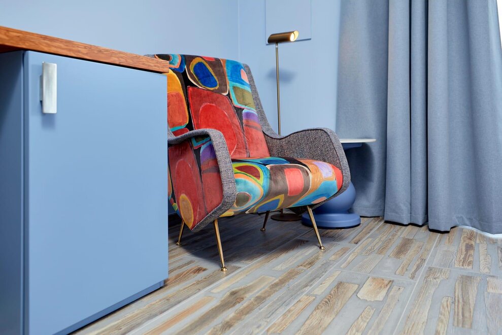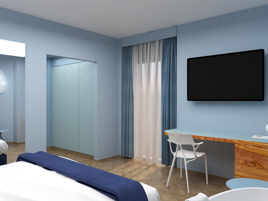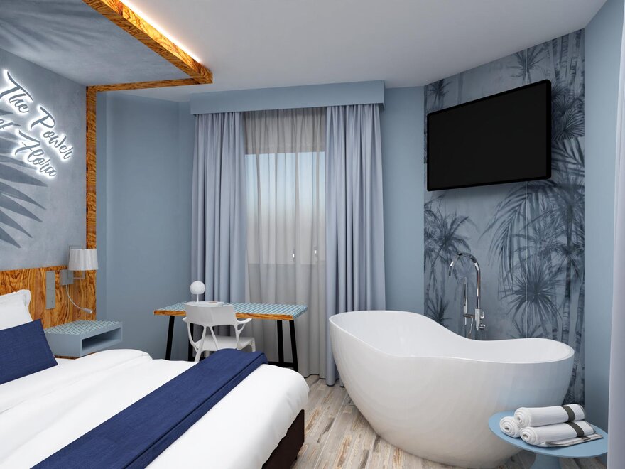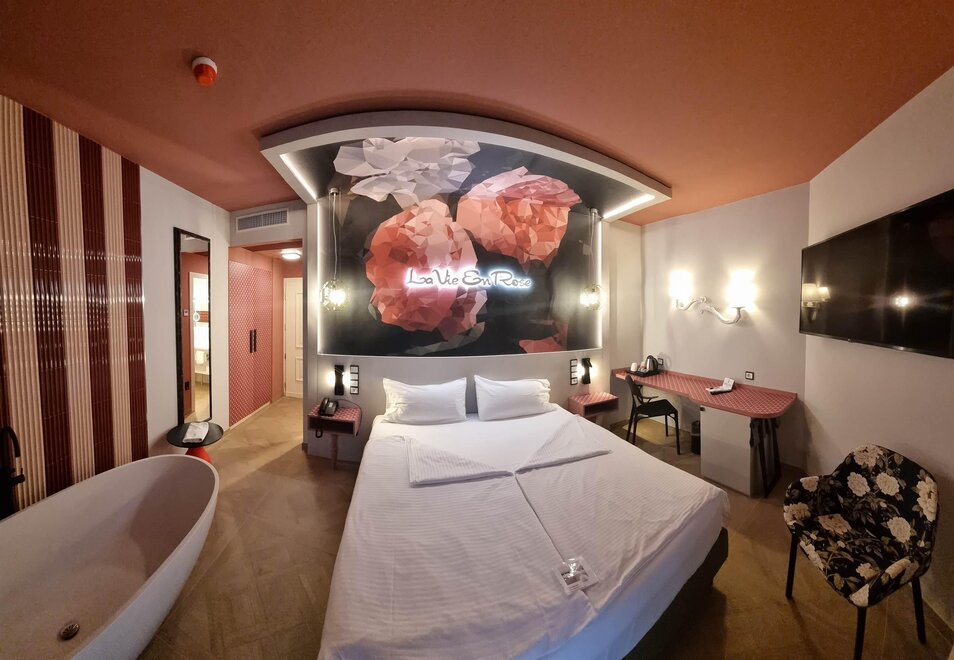 новая комната с инновационным дизайном в оттенках голубого и розового, с высококачественными материалами, такими как оливковое дерево, сочетающаяся с новым ретро стилем, привлекательное освещение, большой телевизор LG, балкон и душ, 18/20 квадратных метров, вид на парковку и улицу