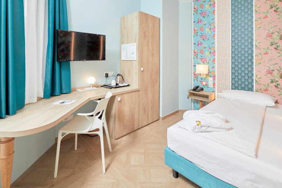 Небольшая комната с окном на юго-восток к лестнице аварийного выхода, без балкона, оснащена односпальной кроватью размером 80x190 см, ванной комнатой с душем