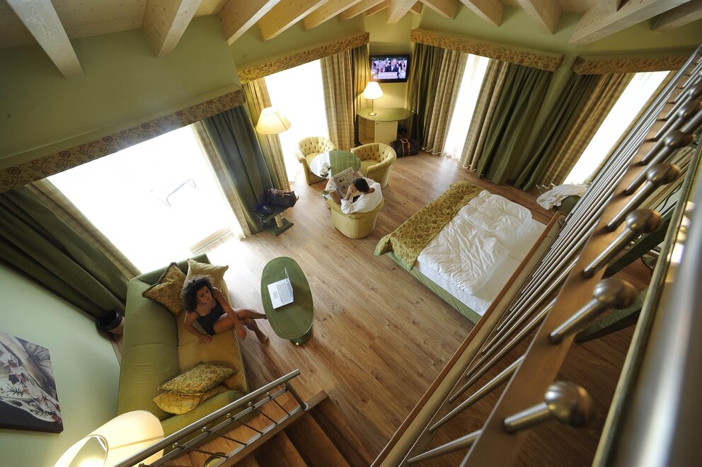 Суит площадью 40 кв.м, выходящий на улицу и боковую сторону, ванная комната с душем, терраса площадью 50 кв.м с гидромассажной ванной, нагреваемой до 30°. Максимальная заполняемость: 4 человека (2 человека на двуспальной кровати и 2 человека на диване-кровати с матрасом толщиной 10 см)