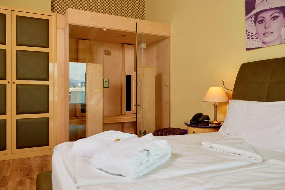 Новые и эксклюзивные номера с двуспальной кроватью (макс. 2 человека), паркетный пол, ванная комната с джакузи без душа, балкон или терраса, боковой вид на парк, горы или парковку на улице. Двуспальная кровать с двуспальным матрасом