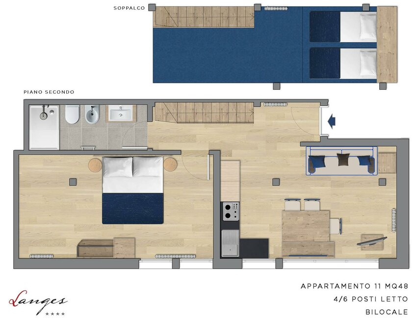 Двухуровневая квартира, состоящая из гостиной с кухонным уголком и двуспальным диваном, спальни с двуспальной кроватью и двух ванных комнат.