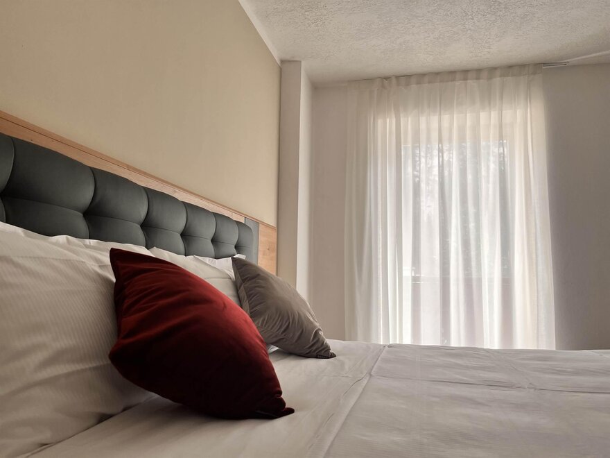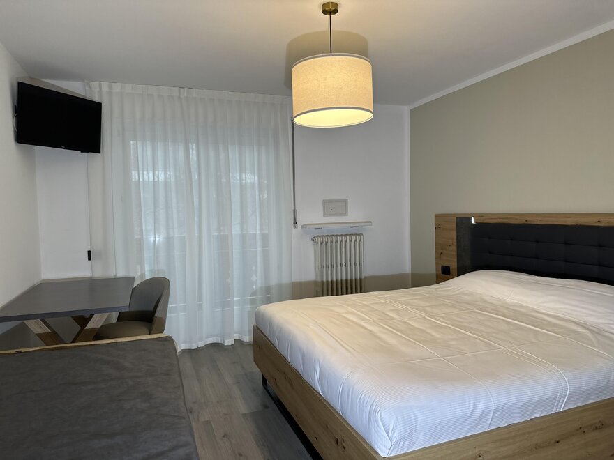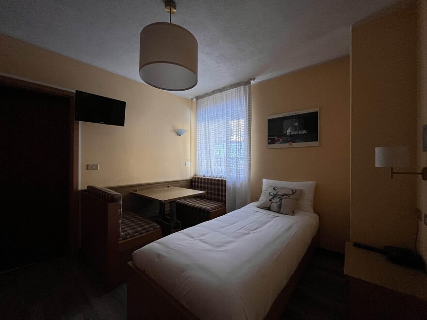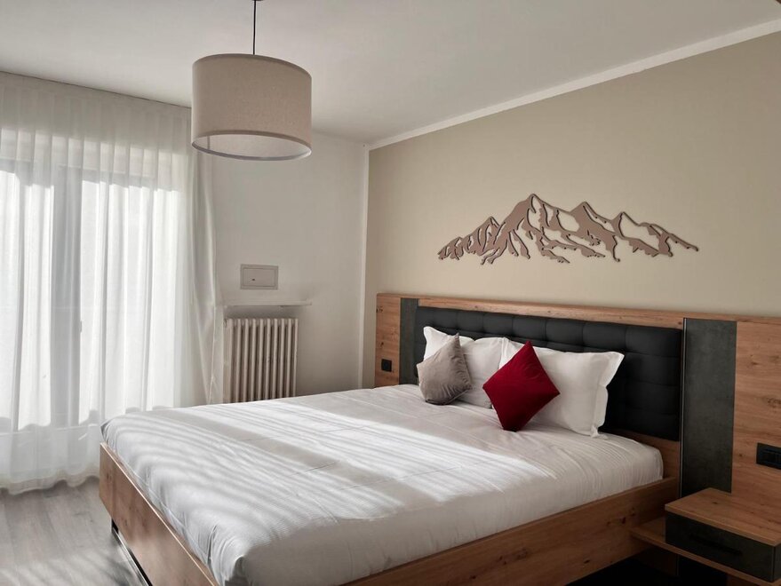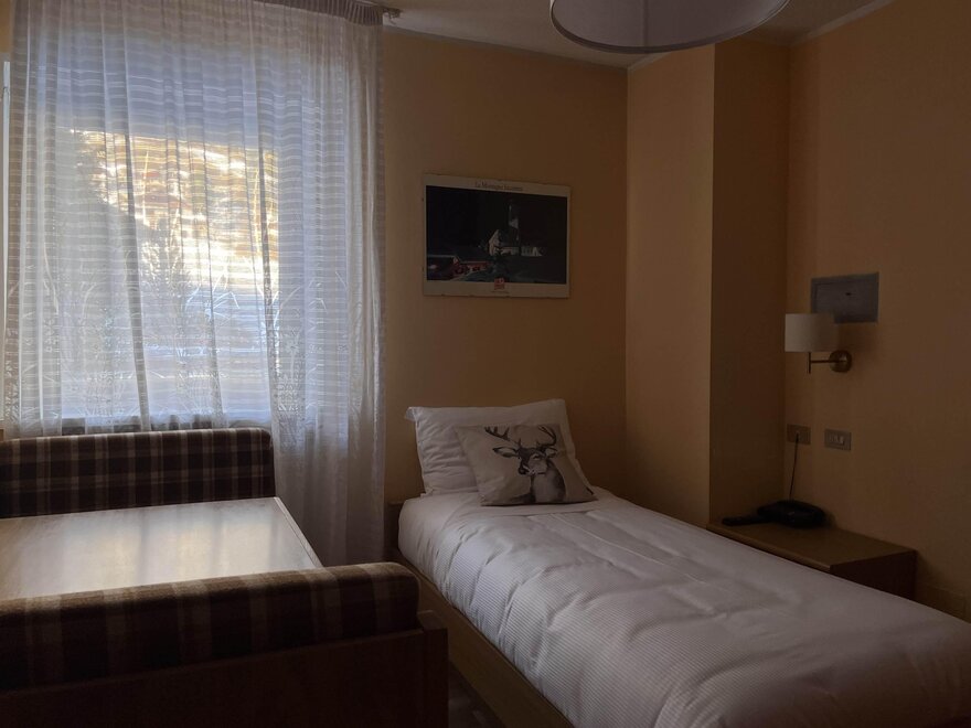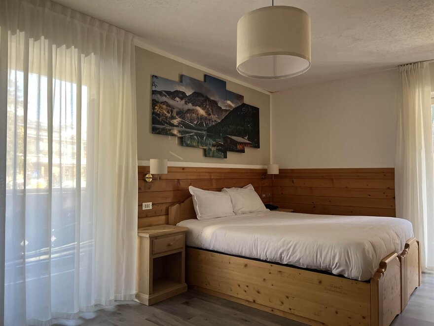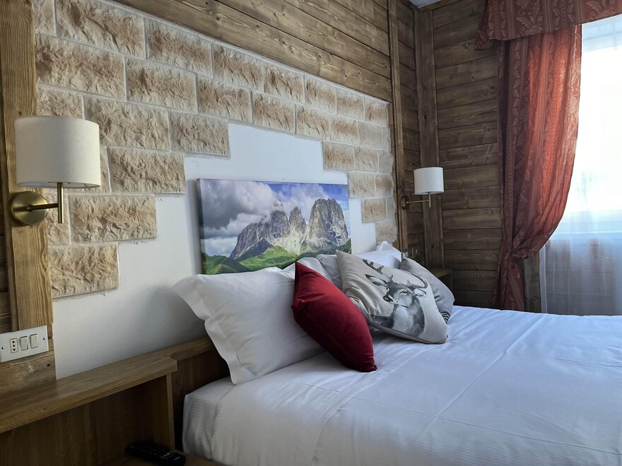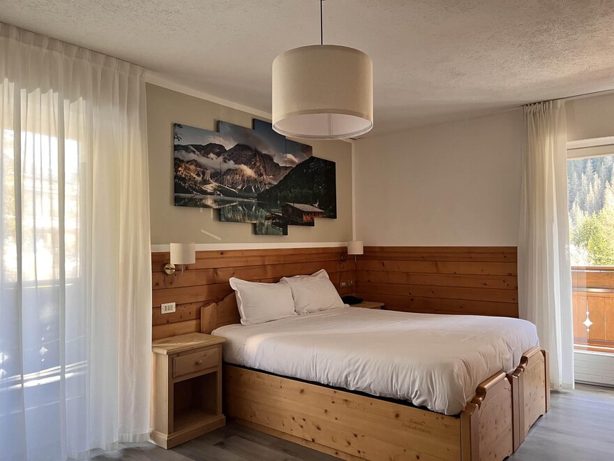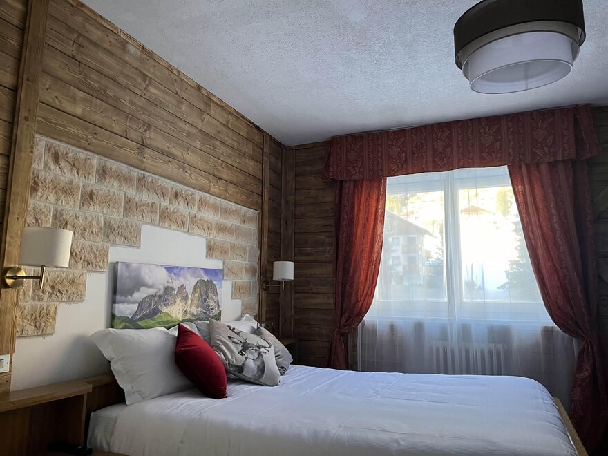 Номер с двумя балконами или окном и балконом, очень светлый, с видом на окружающие нас горы: Группу Катиньо, Сассолунго, Кол Роделла, Пордо и Сас Бечé.Ванные комнаты