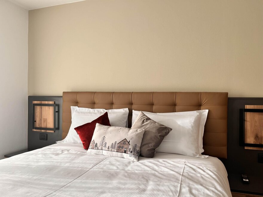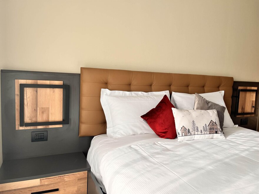 Номера доступны на лифте, имеют паркетный пол, оборудованы всеми необходимыми удобствами, включая: собственную ванную комнату с душевым боксом, набор косметики, фен, телевизор, сейф и бесплатный WI-FI, оформлены в горном стиле.
