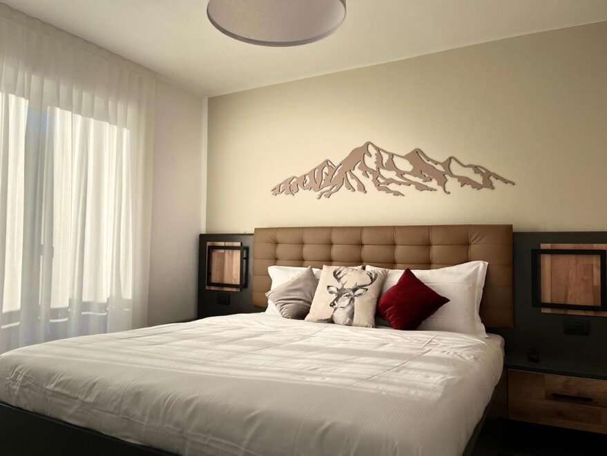 Номера доступны на лифте, имеют ковровое покрытие или паркет, оборудованы всеми необходимыми удобствами, среди которых: индивидуальная ванная комната с душевым кабином, набор для душа, фен, телевизор, сейф и бесплатный Wi-FI, оформлены в горном стиле.