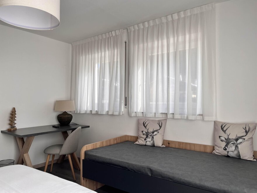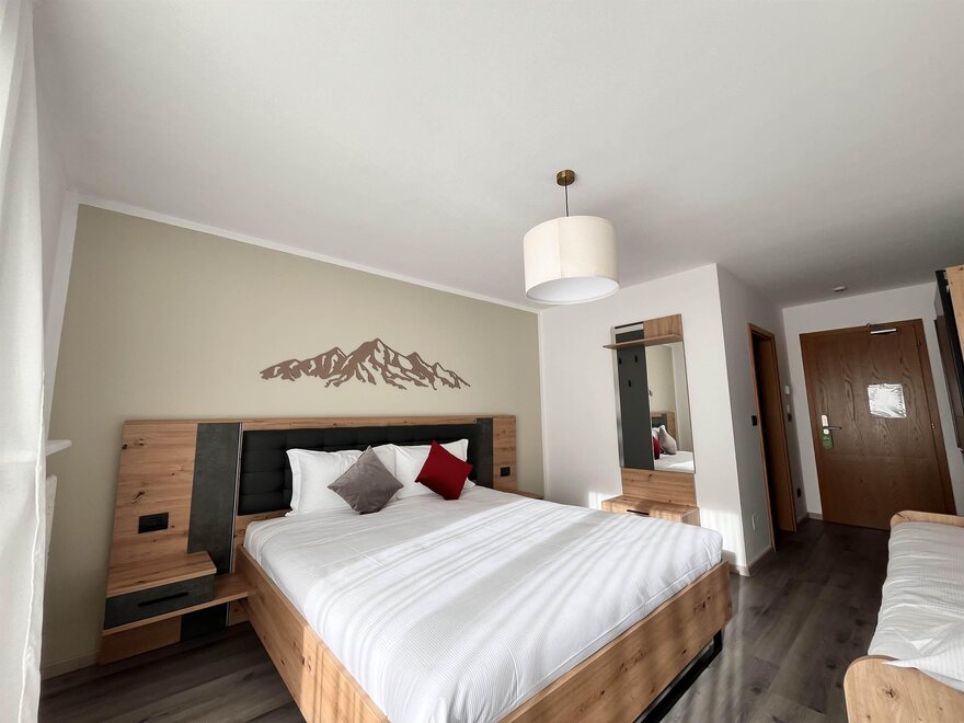 Комнаты доступны на лифте, обустроены покрытием из ковровой плитки, оборудованы всеми необходимыми удобствами: собственная ванная комната с душевой кабиной, набор для ухода, фен, телевизор, сейф и бесплатный WI-FI, обставлены альпийским еловым шкафом с кроватью-чердаком.