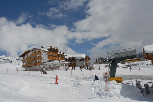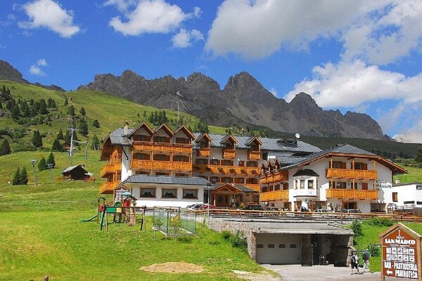 The Hotel San Marco is situated on the San Pellegrino Pass, at an altitude of 1918 metres, just a few kilometres from Moena, in the Fassa Valley. During the winter season our guests leave the hotel with skis on their feet. Indeed, we are surrounded by marvellous ski slopes served by modern ski lifts, with departures directly from the hotel. In Summer our customer finds himself surronded by vasta areas of green pastures, sweet-smelling woods with charming streams and alpine lakes. We offer you a cordial, welcoming atmosphere, ideal for both couples and families with children to spend a relaxing holiday. Our cuisine is prepared to a particularly high standard, with three menus to choose from plus a salad/vegetable buffet and large buffet breakfast. This service are free:Indoor swimming pool,Finnish and bio sauna, salt sauna, Turkish bath, Outdoor hydro-massage 39°C,Fitness room,underground garage.
