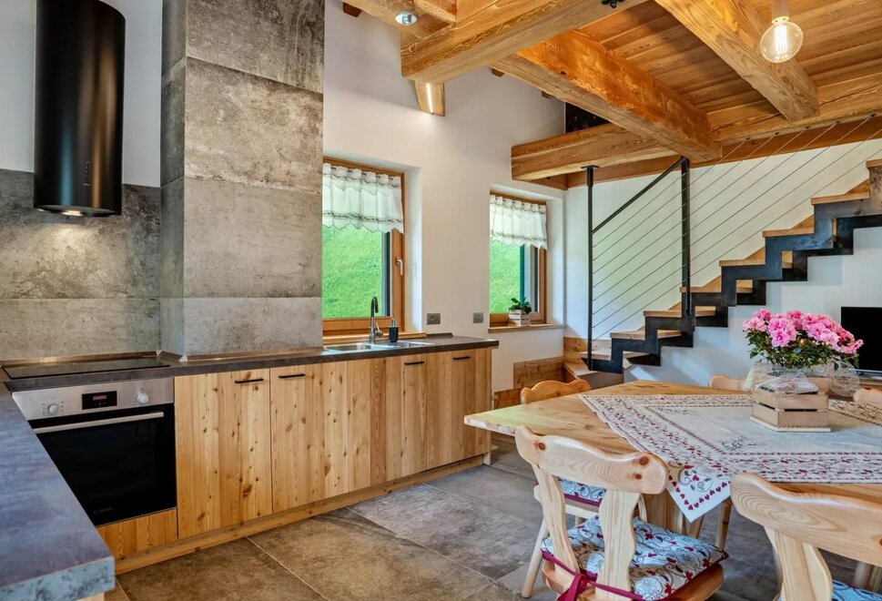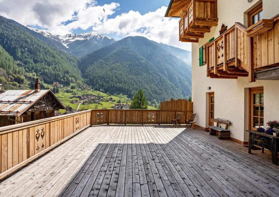Квартира на втором этаже выходит на широкую деревянную террасу с видом на реку Вальорц.