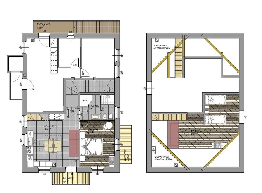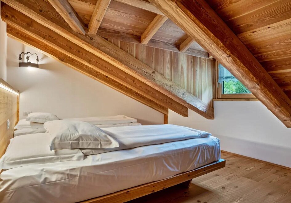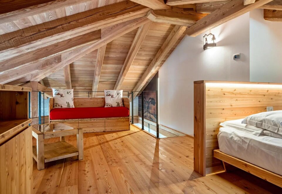Мансарда находится на третьем этаже здания. Она имеет просторную гостиную с видом на деревню Сан-Бернардо и реку Валорц, спальню, ванную комнату и антресоль, которая используется как комната и зона отдыха с диваном-кроватью. В предбаннике имеется частная сауна для эксклюзивного пользования.